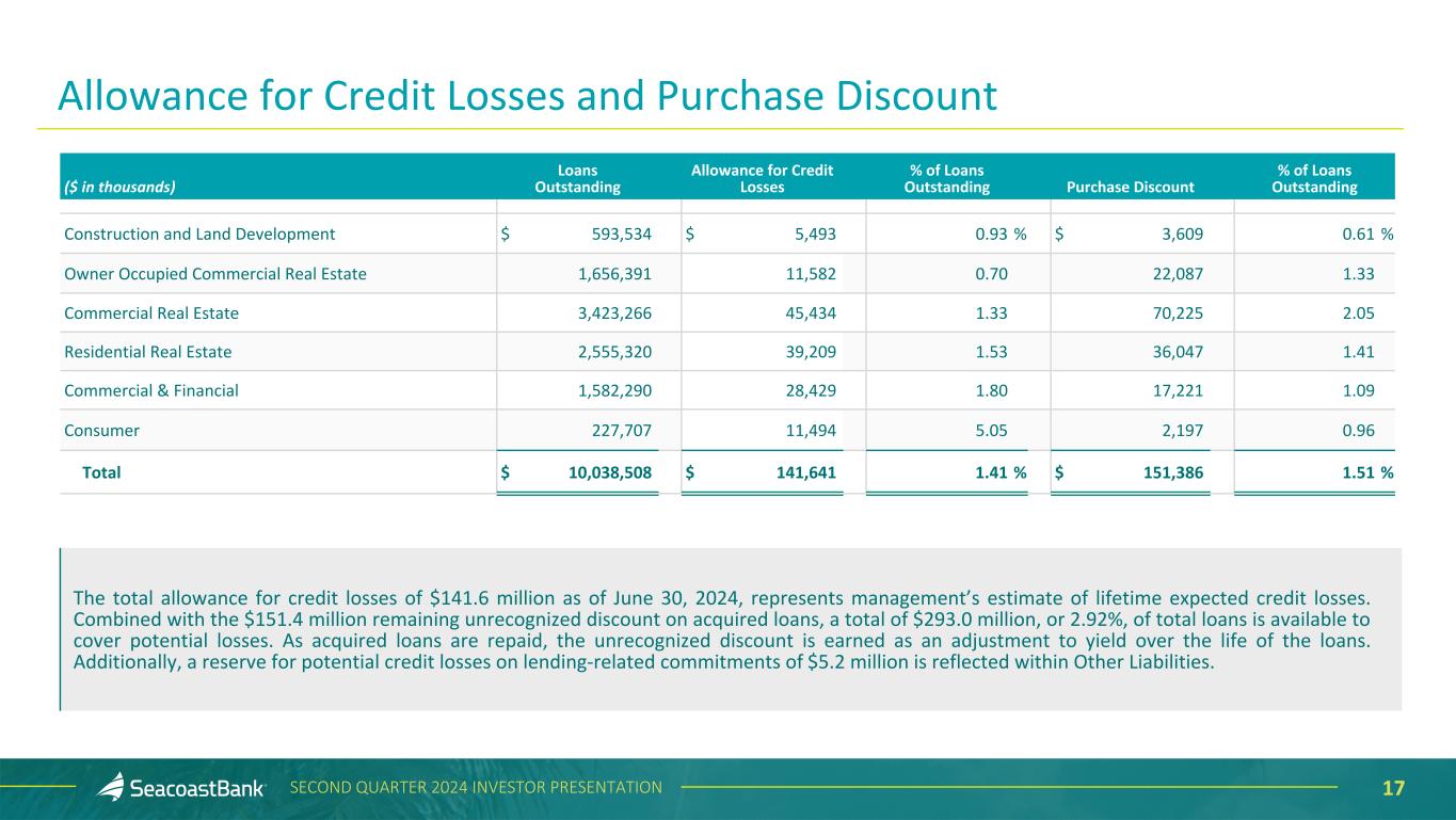 16SECOND QUARTER 2024 INVESTOR PRESENTATION At June 30, 2024 Loan Portfolio Mix Seacoast's lending strategy results in a diverse and granular loan portfolio. Seacoast’s average loan size is $345 thousand and the average commercial loan size is $758 thousand. Portfolio diversification in terms of asset mix, industry, and loan type, has been a critical element of the Company’s lending strategy. Exposures across industries and collateral types are broadly distributed. Construction and land development and commercial real estate loans, as defined in regulatory guidance, represent 34% and 222%, respectively, of total consolidated risk based capital. CRE-Retail, 11.3% CRE-Office, 5.3% CRE-Multifamily 5+, 4.1% CRE-Hotel/Motel, 3.7% CRE-Industrial/Warehouse, 3.8% CRE-Other, 5.8% OOCRE, 16.5% Construction & Land Development, 5.9% Commercial & Financial, 15.8% Residential, 25.5% Consumer, 2.3% Construction & Land Development and CRE Loans to Total Risk Based Capital 252% 222% 59% 34% CRE Construction & Land Development Peers SBCF Peer Source: 1Q’24 S&P Capital