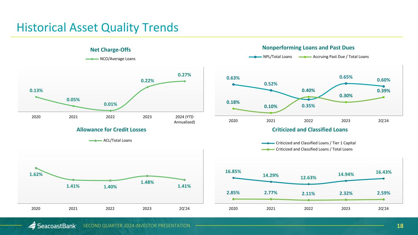 17SECOND QUARTER 2024 INVESTOR PRESENTATION Allowance for Credit Losses and Purchase Discount ($ in thousands) Loans Outstanding Allowance for Credit Losses % of Loans Outstanding Purchase Discount % of Loans Outstanding Construction and Land Development $ 593,534 $ 5,493 0.93 % $ 3,609 0.61 % Owner Occupied Commercial Real Estate 1,656,391 11,582 0.70 22,087 1.33 Commercial Real Estate 3,423,266 45,434 1.33 70,225 2.05 Residential Real Estate 2,555,320 39,209 1.53 36,047 1.41 Commercial & Financial 1,582,290 28,429 1.80 17,221 1.09 Consumer 227,707 11,494 5.05 2,197 0.96 Total $ 10,038,508 $ 141,641 1.41 % $ 151,386 1.51 % The total allowance for credit losses of $141.6 million as of June 30, 2024, represents management’s estimate of lifetime expected credit losses. Combined with the $151.4 million remaining unrecognized discount on acquired loans, a total of $293.0 million, or 2.92%, of total loans is available to cover potential losses. As acquired loans are repaid, the unrecognized discount is earned as an adjustment to yield over the life of the loans. Additionally, a reserve for potential credit losses on lending-related commitments of $5.2 million is reflected within Other Liabilities.