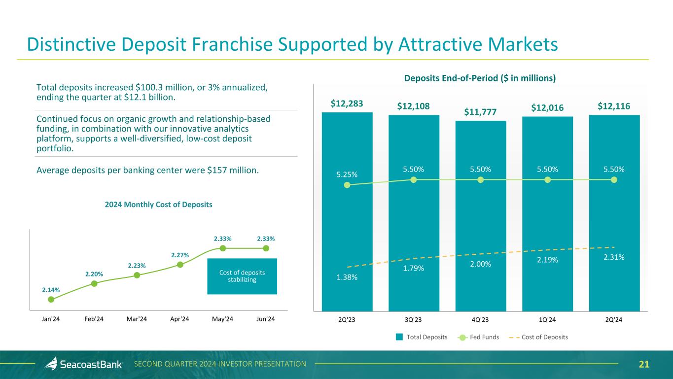 22SECOND QUARTER 2024 INVESTOR PRESENTATION Deposits End-of-Period ($ in millions) $12,283 $12,108 $11,777 $12,016 $12,116 Transaction Accounts Savings Money Market Brokered Time Deposits 2Q'23 3Q'23 4Q'23 1Q'24 2Q'24 Granular, Diverse and Relationship-Focused Customer Funding Base The Company benefits from a granular deposit franchise, with the top ten depositors representing approximately 4% of total deposits. Customer transaction account balances represent 50% of total deposits. Consumer deposits represent 42% of total deposits, with an average balance per account of $25 thousand. Business deposits represent 58% of total deposits, with an average balance per account of $109 thousand. The average tenure for a Seacoast customer is 10 years. 50%52%54%55%57% 5%5%6%6%7% 23% 26% 28% 29% 30% 5% 3% 1% 1% 3% 8% 10% 11% 13% 12%
