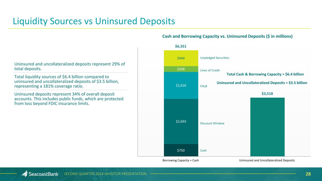 27SECOND QUARTER 2024 INVESTOR PRESENTATION Non-owner Occupied Commercial Real Estate CRE Non-Owner Occupied ($ in ‘000s) Balance Balance % of Total Loans Average Loan Size 30+ Days Past- Accruing Non Accrual Weighted LTV Retail $ 1,132,190 11.3 % $ 2,190 $ — $ 2,273 50 % Office 535,178 5.3 1,538 — 2,916 54 Multifamily 5+ 408,909 4.1 2,076 — — 51 Hotel/Motel 369,211 3.7 3,692 1,641 — 49 Industrial/Warehouse 380,289 3.8 1,901 568 814 53 Other 597,489 6.0 1,043 946 6,069 51 Total $ 3,423,266 34.1 % $ 1,769 $ 3,155 $ 12,072 51 % Retail Segment: Targets grocery or credit tenant anchored shopping plazas, single credit tenant retail buildings, smaller outparcels and other retail units. • 11.3% of total loans. • 50% weighted average loan-to-value, low leverage. • $2.2 million average loan size. • 18 loans over $10 million. Office Segment: Targets low to mid-rise suburban offices, broadly diversified across many professional services. • 5.3% of total loans. • 54% weighted average loan-to-value, low leverage. • $1.5 million average loan size. • Five loans over $10 million.