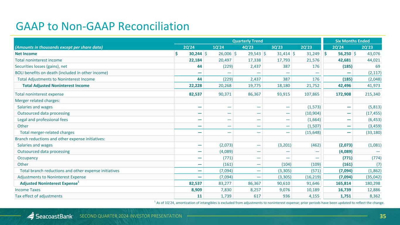 34SECOND QUARTER 2024 INVESTOR PRESENTATION This presentation contains financial information determined by methods other than Generally Accepted Accounting Principles (“GAAP”). The financial highlights provide reconciliations between GAAP and adjusted financial measures including net income, noninterest income, noninterest expense, tax adjustments and other financial ratios. Management uses these non-GAAP financial measures in its analysis of the Company’s performance and believes these presentations provide useful supplemental information, and a clearer understanding of the Company’s performance. The Company believes the non-GAAP measures enhance investors’ understanding of the Company’s business and performance and if not provided would be requested by the investor community. These measures are also useful in understanding performance trends and facilitate comparisons with the performance of other financial institutions. The limitations associated with operating measures are the risk that persons might disagree as to the appropriateness of items comprising these measures and that different companies might define or calculate these measures differently. The Company provides reconciliations between GAAP and these non-GAAP measures. These disclosures should not be considered an alternative to GAAP. Explanation of Certain Unaudited Non-GAAP Financial Measures