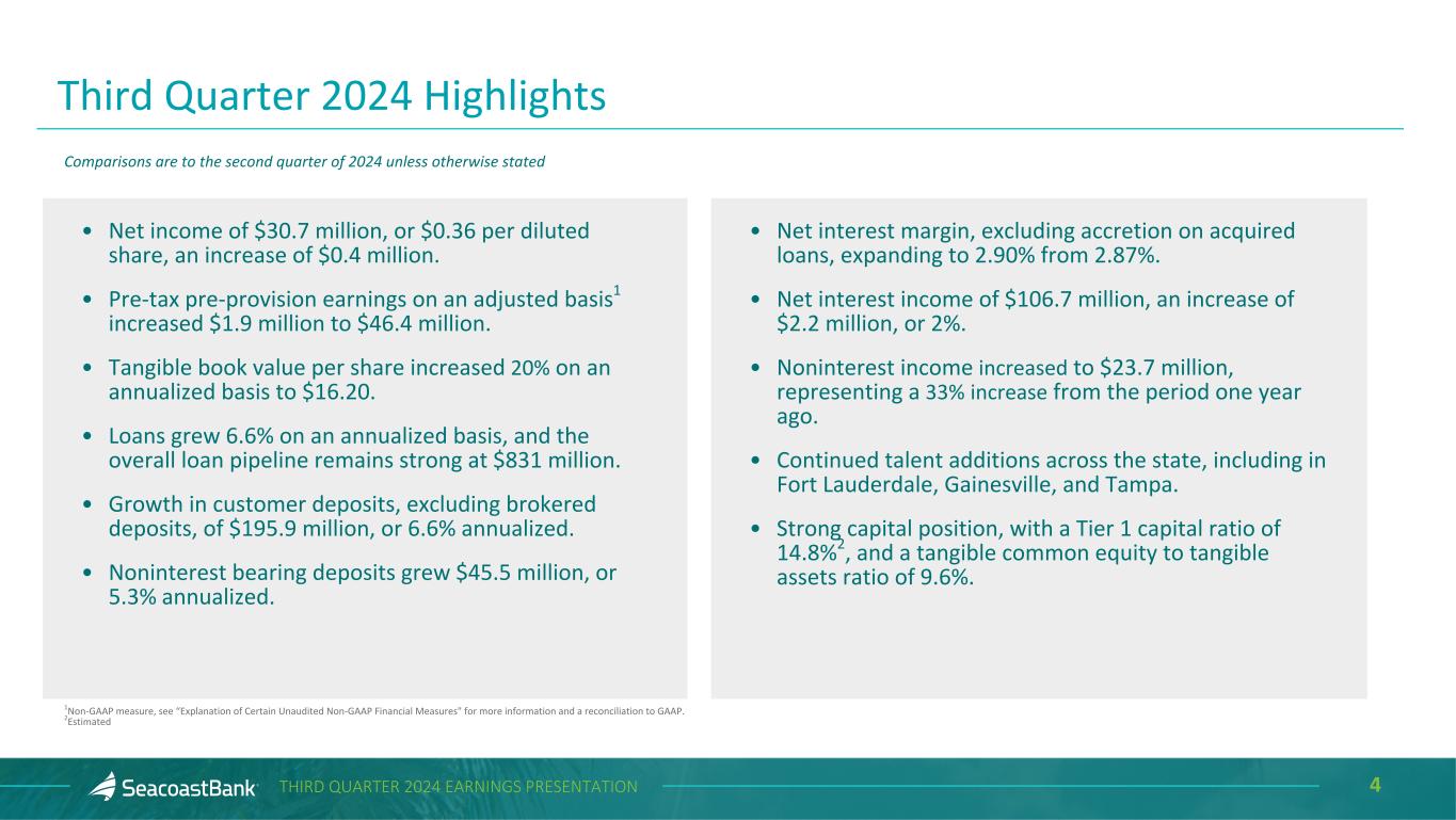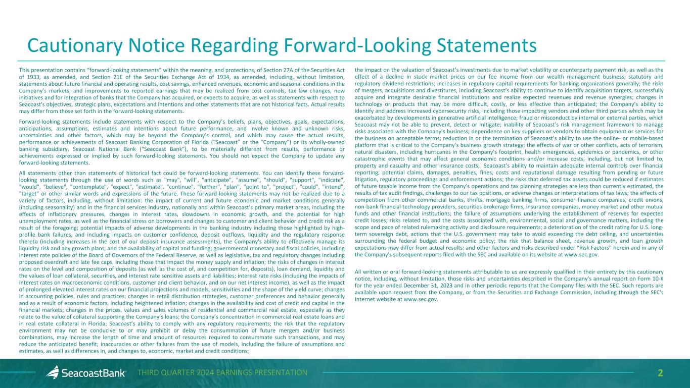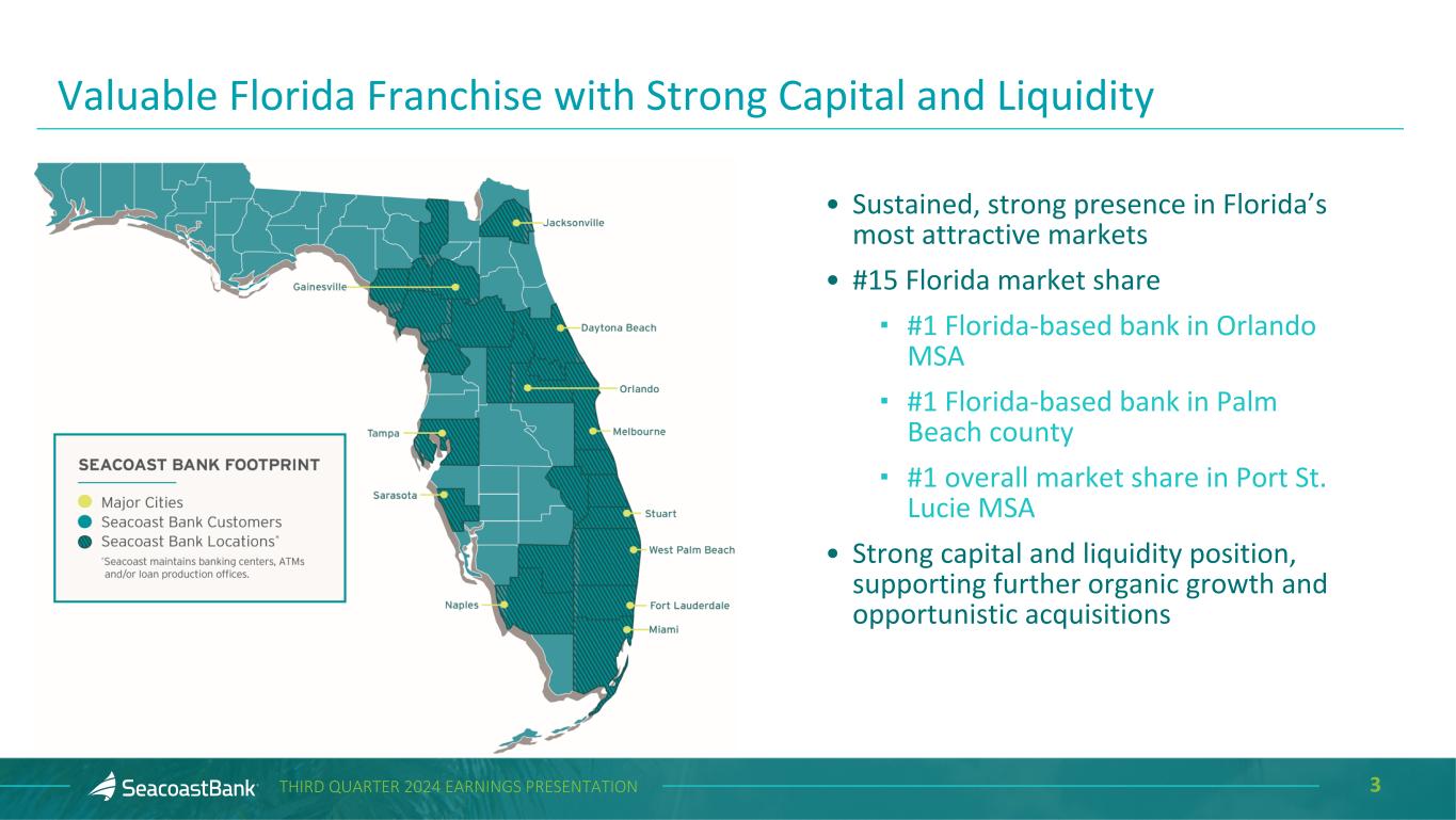 2THIRD QUARTER 2024 EARNINGS PRESENTATION Cautionary Notice Regarding Forward-Looking Statements This presentation contains “forward-looking statements” within the meaning, and protections, of Section 27A of the Securities Act of 1933, as amended, and Section 21E of the Securities Exchange Act of 1934, as amended, including, without limitation, statements about future financial and operating results, cost savings, enhanced revenues, economic and seasonal conditions in the Company’s markets, and improvements to reported earnings that may be realized from cost controls, tax law changes, new initiatives and for integration of banks that the Company has acquired, or expects to acquire, as well as statements with respect to Seacoast's objectives, strategic plans, expectations and intentions and other statements that are not historical facts. Actual results may differ from those set forth in the forward-looking statements. Forward-looking statements include statements with respect to the Company’s beliefs, plans, objectives, goals, expectations, anticipations, assumptions, estimates and intentions about future performance, and involve known and unknown risks, uncertainties and other factors, which may be beyond the Company’s control, and which may cause the actual results, performance or achievements of Seacoast Banking Corporation of Florida (“Seacoast” or the “Company”) or its wholly-owned banking subsidiary, Seacoast National Bank (“Seacoast Bank”), to be materially different from results, performance or achievements expressed or implied by such forward-looking statements. You should not expect the Company to update any forward-looking statements. All statements other than statements of historical fact could be forward-looking statements. You can identify these forward- looking statements through the use of words such as "may", "will", "anticipate", "assume", "should", "support", "indicate", "would", "believe", "contemplate", "expect", "estimate", "continue", "further", "plan", "point to", "project", "could", "intend", "target" or other similar words and expressions of the future. These forward-looking statements may not be realized due to a variety of factors, including, without limitation: the impact of current and future economic and market conditions generally (including seasonality) and in the financial services industry, nationally and within Seacoast’s primary market areas, including the effects of inflationary pressures, changes in interest rates, slowdowns in economic growth, and the potential for high unemployment rates, as well as the financial stress on borrowers and changes to customer and client behavior and credit risk as a result of the foregoing; potential impacts of adverse developments in the banking industry including those highlighted by high- profile bank failures, and including impacts on customer confidence, deposit outflows, liquidity and the regulatory response thereto (including increases in the cost of our deposit insurance assessments), the Company's ability to effectively manage its liquidity risk and any growth plans, and the availability of capital and funding; governmental monetary and fiscal policies, including interest rate policies of the Board of Governors of the Federal Reserve, as well as legislative, tax and regulatory changes including proposed overdraft and late fee caps, including those that impact the money supply and inflation; the risks of changes in interest rates on the level and composition of deposits (as well as the cost of, and competition for, deposits), loan demand, liquidity and the values of loan collateral, securities, and interest rate sensitive assets and liabilities; interest rate risks (including the impacts of interest rates on macroeconomic conditions, customer and client behavior, and on our net interest income), as well as the impact of prolonged elevated interest rates on our financial projections and models, sensitivities and the shape of the yield curve; changes in accounting policies, rules and practices; changes in retail distribution strategies, customer preferences and behavior generally and as a result of economic factors, including heightened inflation; changes in the availability and cost of credit and capital in the financial markets; changes in the prices, values and sales volumes of residential and commercial real estate, especially as they relate to the value of collateral supporting the Company’s loans; the Company’s concentration in commercial real estate loans and in real estate collateral in Florida; Seacoast’s ability to comply with any regulatory requirements; the risk that the regulatory environment may not be conducive to or may prohibit or delay the consummation of future mergers and/or business combinations, may increase the length of time and amount of resources required to consummate such transactions, and may reduce the anticipated benefit; inaccuracies or other failures from the use of models, including the failure of assumptions and estimates, as well as differences in, and changes to, economic, market and credit conditions; the impact on the valuation of Seacoast’s investments due to market volatility or counterparty payment risk, as well as the effect of a decline in stock market prices on our fee income from our wealth management business; statutory and regulatory dividend restrictions; increases in regulatory capital requirements for banking organizations generally; the risks of mergers, acquisitions and divestitures, including Seacoast’s ability to continue to identify acquisition targets, successfully acquire and integrate desirable financial institutions and realize expected revenues and revenue synergies; changes in technology or products that may be more difficult, costly, or less effective than anticipated; the Company’s ability to identify and address increased cybersecurity risks, including those impacting vendors and other third parties which may be 