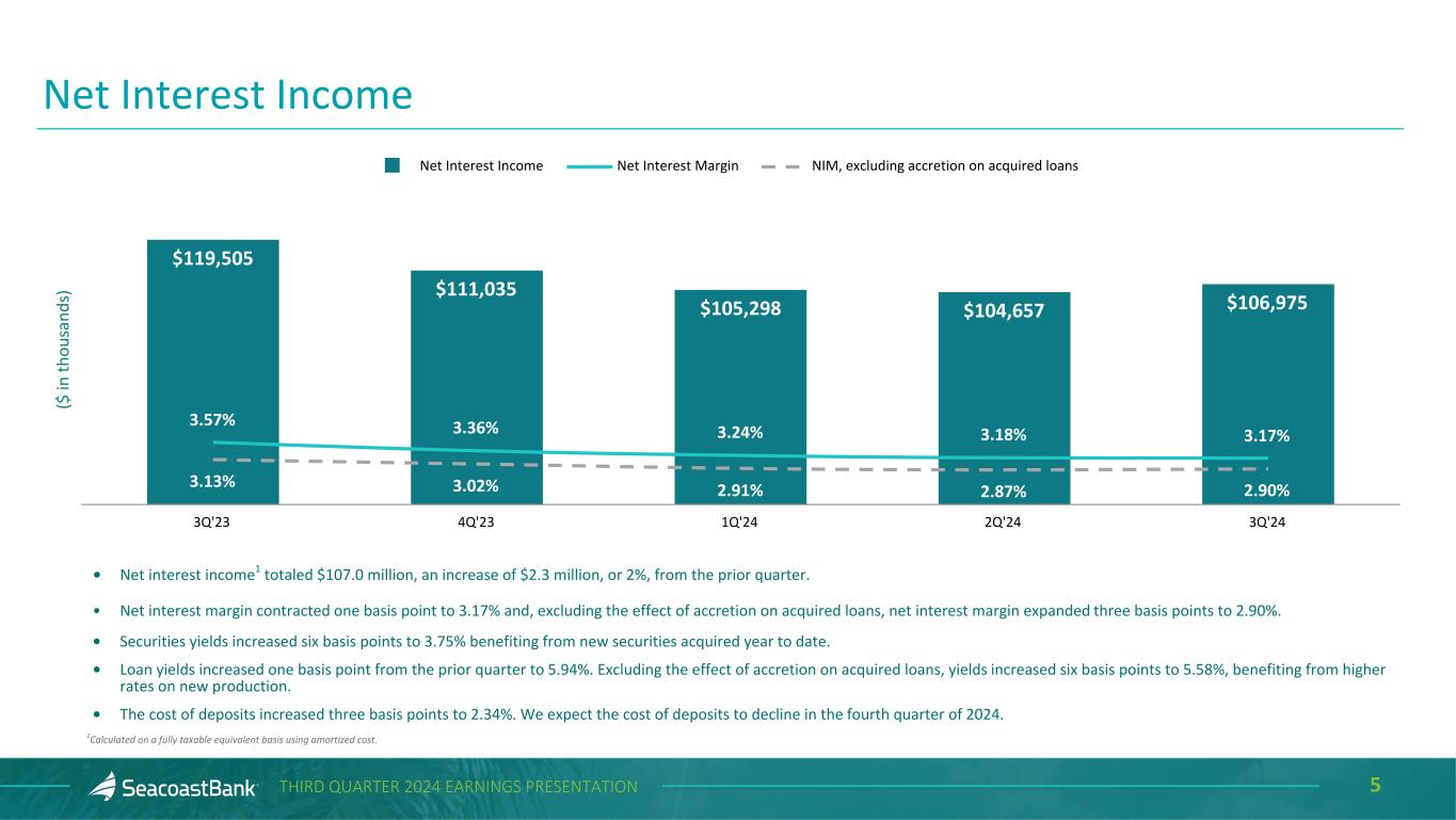 4THIRD QUARTER 2024 EARNINGS PRESENTATION • Net income of $30.7 million, or $0.36 per diluted share, an increase of $0.4 million. • Pre-tax pre-provision earnings on an adjusted basis1 increased $1.9 million to $46.4 million. • Tangible book value per share increased 20% on an annualized basis to $16.20. • Loans grew 6.6% on an annualized basis, and the overall loan pipeline remains strong at $831 million. • Growth in customer deposits, excluding brokered deposits, of $195.9 million, or 6.6% annualized. • Noninterest bearing deposits grew $45.5 million, or 5.3% annualized. Third Quarter 2024 Highlights Comparisons are to the second quarter of 2024 unless otherwise stated • Net interest margin, excluding accretion on acquired loans, expanding to 2.90% from 2.87%. • Net interest income of $106.7 million, an increase of $2.2 million, or 2%. • Noninterest income increased to $23.7 million, representing a 33% increase from the period one year ago. • Continued talent additions across the state, including in Fort Lauderdale, Gainesville, and Tampa. • Strong capital position, with a Tier 1 capital ratio of 14.8%2, and a tangible common equity to tangible assets ratio of 9.6%. 1Non-GAAP measure, see “Explanation of Certain Unaudited Non-GAAP Financial Measures" for more information and a reconciliation to GAAP. 2Estimated