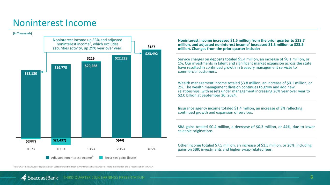 5THIRD QUARTER 2024 EARNINGS PRESENTATION Net Interest Income ($ in th ou sa nd s) $119,505 $111,035 $105,298 $104,657 $106,975 3.57% 3.36% 3.24% 3.18% 3.17% 3.13% 3.02% 2.91% 2.87% 2.90% Net Interest Income Net Interest Margin NIM, excluding accretion on acquired loans 3Q'23 4Q'23 1Q'24 2Q'24 3Q'24 • Net interest income1 totaled $107.0 million, an increase of $2.3 million, or 2%, from the prior quarter. • Net interest margin contracted one basis point to 3.17% and, excluding the effect of accretion on acquired loans, net interest margin expanded three basis points to 2.90%. • Securities yields increased six basis points to 3.75% benefiting from new securities acquired year to date. • Loan yields increased one basis point from the prior quarter to 5.94%. Excluding the effect of accretion on acquired loans, yields increased six basis points to 5.58%, benefiting from higher rates on new production. • The cost of deposits increased three basis points to 2.34%. We expect the cost of deposits to decline in the fourth quarter of 2024. 1Calculated on a fully taxable equivalent basis using amortized cost.