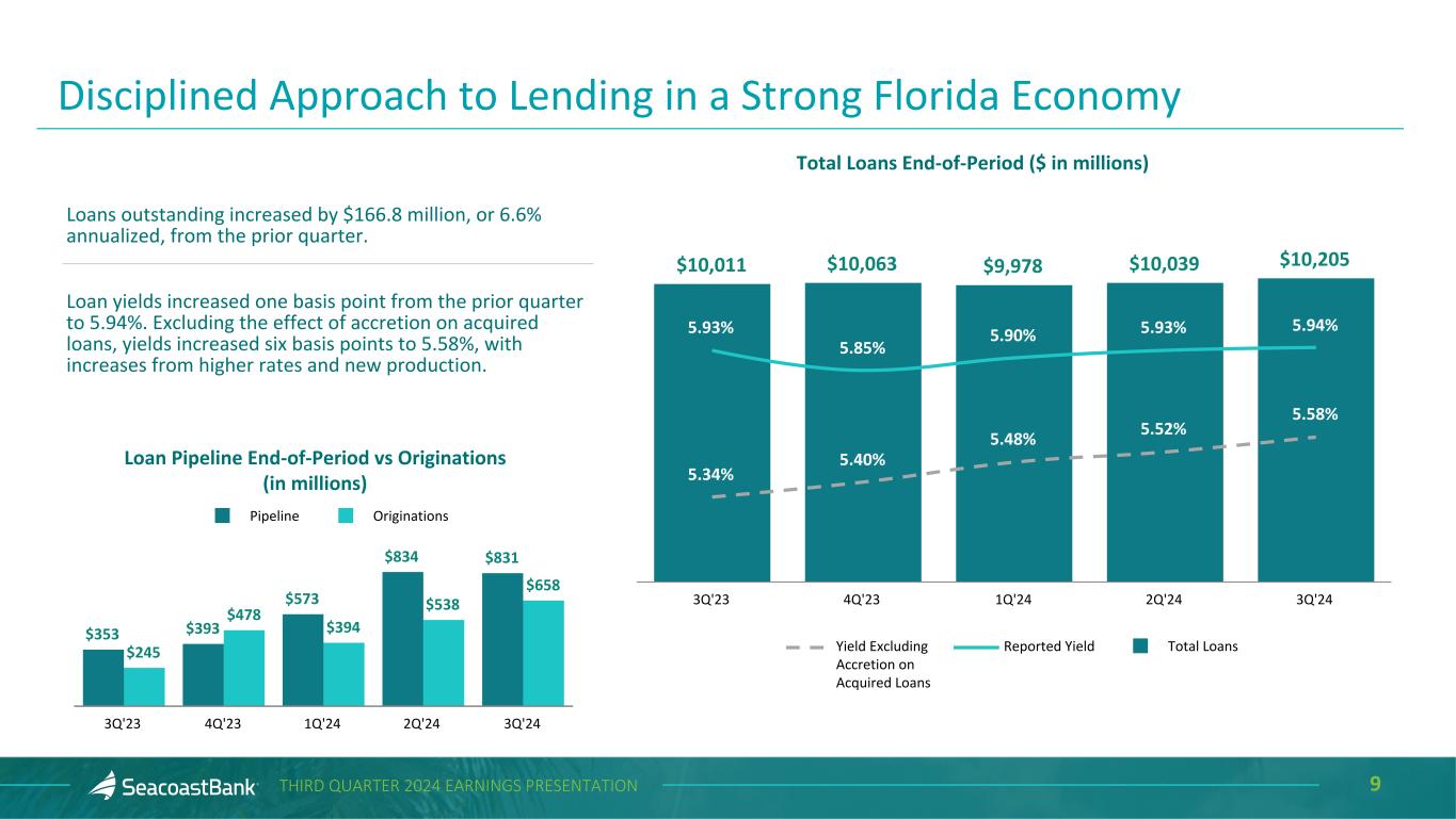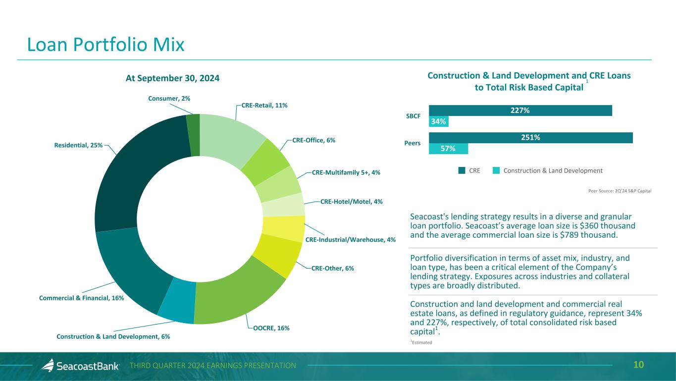 9THIRD QUARTER 2024 EARNINGS PRESENTATION $353 $393 $573 $834 $831 $245 $478 $394 $538 $658 Pipeline Originations 3Q'23 4Q'23 1Q'24 2Q'24 3Q'24 Loan Pipeline End-of-Period vs Originations (in millions) $10,011 $10,063 $9,978 $10,039 $10,205 5.93% 5.85% 5.90% 5.93% 5.94% 5.34% 5.40% 5.48% 5.52% 5.58% Yield Excluding Accretion on Acquired Loans Reported Yield Total Loans 3Q'23 4Q'23 1Q'24 2Q'24 3Q'24 Total Loans End-of-Period ($ in millions) Disciplined Approach to Lending in a Strong Florida Economy Loans outstanding increased by $166.8 million, or 6.6% annualized, from the prior quarter. Loan yields increased one basis point from the prior quarter to 5.94%. Excluding the effect of accretion on acquired loans, yields increased six basis points to 5.58%, with increases from higher rates and new production.