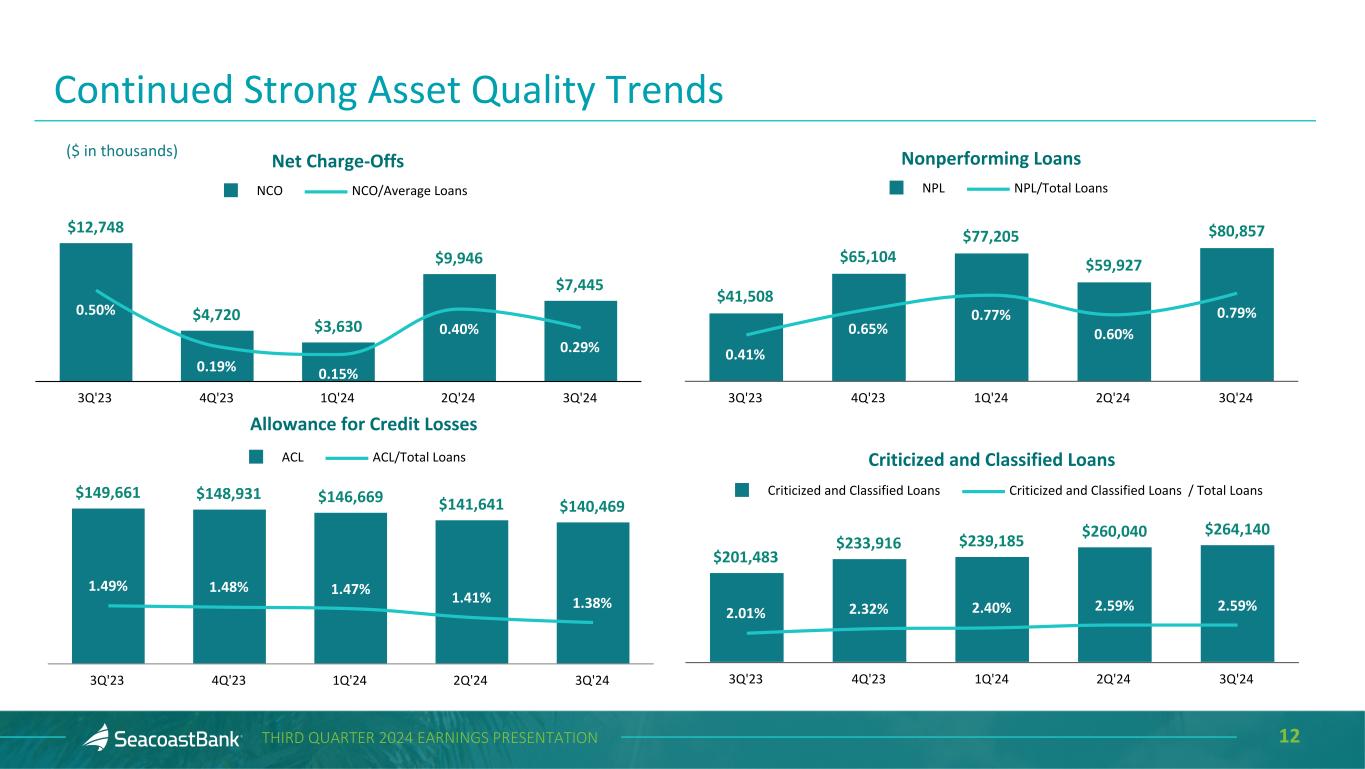 11THIRD QUARTER 2024 EARNINGS PRESENTATION Allowance for Credit Losses and Purchase Discount ($ in thousands) Loans Outstanding Allowance for Credit Losses % of Loans Outstanding Purchase Discount % of Loans Outstanding Construction and Land Development $ 595,753 $ 7,058 1.18 % $ 3,193 0.54 % Owner Occupied Commercial Real Estate 1,676,814 11,918 0.71 20,464 1.22 Commercial Real Estate 3,573,076 45,676 1.28 65,500 1.83 Residential Real Estate 2,564,903 39,148 1.53 35,086 1.37 Commercial & Financial 1,575,228 25,978 1.65 15,700 1.00 Consumer 219,507 10,691 4.87 1,892 0.86 Total $ 10,205,281 $ 140,469 1.38 % $ 141,835 1.39 % The total allowance for credit losses of $140.5 million as of September 30, 2024, represents management’s estimate of lifetime expected credit losses. The $141.8 million remaining unrecognized discount on acquired loans represents 1.39% of total loans. Additionally, a reserve for potential credit losses on lending-related commitments of $5.4 million is reflected within Other Liabilities.