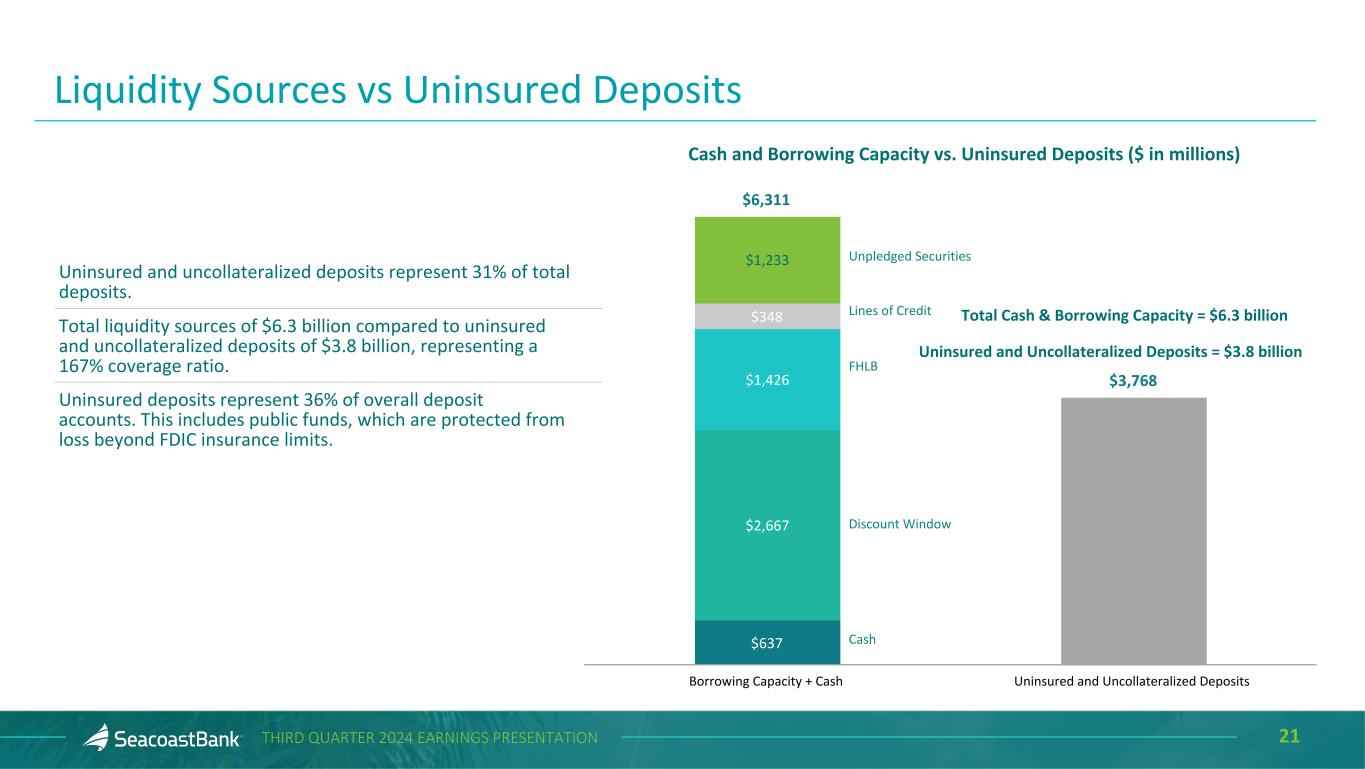 20THIRD QUARTER 2024 EARNINGS PRESENTATION Non-owner Occupied Commercial Real Estate CRE Non-Owner Occupied ($ in ‘000s) Balance Balance % of Total Loans Average Loan Size 30+ Days Past- Accruing Non Accrual Weighted LTV Retail $ 1,135,452 11.1 % $ 2,248 $ 324 $ — 50 % Office 561,984 5.5 1,678 — 2,914 54 Multifamily 5+ 458,588 4.5 2,259 — 3,189 51 Hotel/Motel 363,324 3.6 3,707 3,341 15,684 49 Industrial/Warehouse 429,894 4.2 2,128 2,554 195 54 Other 623,834 6.1 1,147 2,377 6,724 51 Total $ 3,573,076 35.0 % $ 1,893 $ 8,596 $ 28,706 51 % Retail Segment: Targets grocery or credit tenant anchored shopping plazas, single credit tenant retail buildings, smaller outparcels and other retail units. • 11.1% of total loans. • 50% weighted average loan-to-value, low leverage. • $2.2 million average loan size. • 19 loans over $10 million. Office Segment: Targets low to mid-rise suburban offices, broadly diversified across many professional services. • 5.5% of total loans. • 54% weighted average loan-to-value, low leverage. • $1.7 million average loan size. • Seven loans over $10 million.