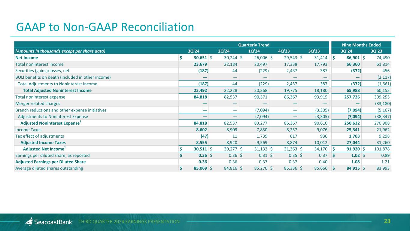 22THIRD QUARTER 2024 EARNINGS PRESENTATION This presentation contains financial information determined by methods other than Generally Accepted Accounting Principles (“GAAP”). The financial highlights provide reconciliations between GAAP and adjusted financial measures including net income, noninterest income, noninterest expense, tax adjustments and other financial ratios. Management uses these non-GAAP financial measures in its analysis of the Company’s performance and believes these presentations provide useful supplemental information, and a clearer understanding of the Company’s performance. The Company believes the non-GAAP measures enhance investors’ understanding of the Company’s business and performance and if not provided would be requested by the investor community. These measures are also useful in understanding performance trends and facilitate comparisons with the performance of other financial institutions. The limitations associated with operating measures are the risk that persons might disagree as to the appropriateness of items comprising these measures and that different companies might define or calculate these measures differently. The Company provides reconciliations between GAAP and these non-GAAP measures. These disclosures should not be considered an alternative to GAAP. Explanation of Certain Unaudited Non-GAAP Financial Measures