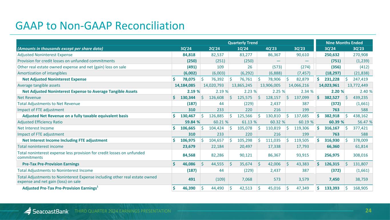 23THIRD QUARTER 2024 EARNINGS PRESENTATION Quarterly Trend Nine Months Ended (Amounts in thousands except per share data) 3Q'24 2Q'24 1Q'24 4Q'23 3Q'23 3Q'24 3Q'23 Net Income $ 30,651 $ 30,244 $ 26,006 $ 29,543 $ 31,414 $ 86,901 $ 74,490 Total noninterest income 23,679 22,184 20,497 17,338 17,793 66,360 61,814 Securities (gains)/losses, net (187) 44 (229) 2,437 387 (372) 456 BOLI benefits on death (included in other income) — — — — — — (2,117) Total Adjustments to Noninterest Income (187) 44 (229) 2,437 387 (372) (1,661) Total Adjusted Noninterest Income 23,492 22,228 20,268 19,775 18,180 65,988 60,153 Total noninterest expense 84,818 82,537 90,371 86,367 93,915 257,726 309,255 Merger related charges — — — — — — (33,180) Branch reductions and other expense initiatives — — (7,094) — (3,305) (7,094) (5,167) Adjustments to Noninterest Expense — — (7,094) — (3,305) (7,094) (38,347) Adjusted Noninterest Expense1 84,818 82,537 83,277 86,367 90,610 250,632 270,908 Income Taxes 8,602 8,909 7,830 8,257 9,076 25,341 21,962 Tax effect of adjustments (47) 11 1,739 617 936 1,703 9,298 Adjusted Income Taxes 8,555 8,920 9,569 8,874 10,012 27,044 31,260 Adjusted Net Income1 $ 30,511 $ 30,277 $ 31,132 $ 31,363 $ 34,170 $ 91,920 $ 101,878 Earnings per diluted share, as reported $ 0.36 $ 0.36 $ 0.31 $ 0.35 $ 0.37 $ 1.02 $ 0.89 Adjusted Earnings per Diluted Share 0.36 0.36 0.37 0.37 0.40 1.08 1.21 Average diluted shares outstanding $ 85,069 $ 84,816 $ 85,270 $ 85,336 $ 85,666 $ 84,915 $ 83,993 GAAP to Non-GAAP Reconciliation