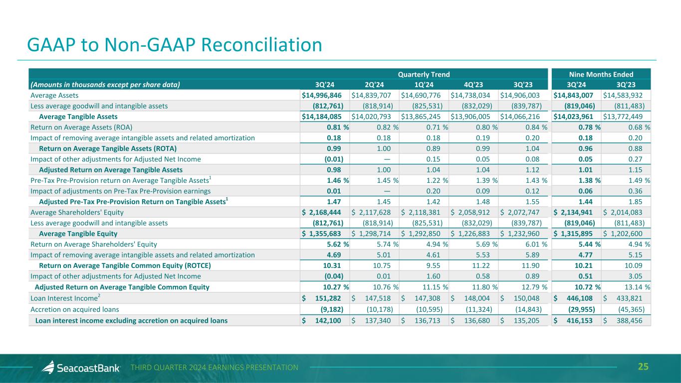 24THIRD QUARTER 2024 EARNINGS PRESENTATION Quarterly Trend Nine Months Ended (Amounts in thousands except per share data) 3Q'24 2Q'24 1Q'24 4Q'23 3Q'23 3Q'24 3Q'23 Adjusted Noninterest Expense 84,818 82,537 83,277 86,367 90,610 250,632 270,908 Provision for credit losses on unfunded commitments (250) (251) (250) — — (751) (1,239) Other real estate owned expense and net (gain) loss on sale (491) 109 26 (573) (274) (356) (412) Amortization of intangibles (6,002) (6,003) (6,292) (6,888) (7,457) (18,297) (21,838) Net Adjusted Noninterest Expense $ 78,075 $ 76,392 $ 76,761 $ 78,906 $ 82,879 $ 231,228 $ 247,419 Average tangible assets 14,184,085 14,020,793 13,865,245 13,906,005 14,066,216 14,023,961 13,772,449 Net Adjusted Noninterest Expense to Average Tangible Assets 2.19 % 2.19 % 2.23 % 2.25 % 2.34 % 2.20 % 2.40 % Net Revenue $ 130,344 $ 126,608 $ 125,575 $ 128,157 $ 137,099 $ 382,527 $ 439,235 Total Adjustments to Net Revenue (187) 44 (229) 2,437 387 (372) (1,661) Impact of FTE adjustment 310 233 220 216 199 763 588 Adjusted Net Revenue on a fully taxable equivalent basis $ 130,467 $ 126,885 $ 125,566 $ 130,810 $ 137,685 $ 382,918 $ 438,162 Adjusted Efficiency Ratio 59.84 % 60.21 % 61.13 % 60.32 % 60.19 % 60.39 % 56.47 % Net Interest Income $ 106,665 $ 104,424 $ 105,078 $ 110,819 $ 119,306 $ 316,167 $ 377,421 Impact of FTE adjustment 310 233 220 216 199 763 588 Net Interest Income Including FTE adjustment $ 106,975 $ 104,657 $ 105,298 $ 111,035 $ 119,505 $ 316,930 $ 378,009 Total noninterest income 23,679 22,184 20,497 17,338 17,793 66,360 61,814 Total noninterest expense less provision for credit losses on unfunded commitments 84,568 82,286 90,121 86,367 93,915 256,975 308,016 Pre-Tax Pre-Provision Earnings $ 46,086 $ 44,555 $ 35,674 $ 42,006 $ 43,383 $ 126,315 $ 131,807 Total Adjustments to Noninterest Income (187) 44 (229) 2,437 387 (372) (1,661) Total Adjustments to Noninterest Expense including other real estate owned expense and net gain (loss) on sale 491 (109) 7,068 573 3,579 7,450 38,759 Adjusted Pre-Tax Pre-Provision Earnings1 $ 46,390 $ 44,490 $ 42,513 $ 45,016 $ 47,349 $ 133,393 $ 168,905 GAAP to Non-GAAP Reconciliation
