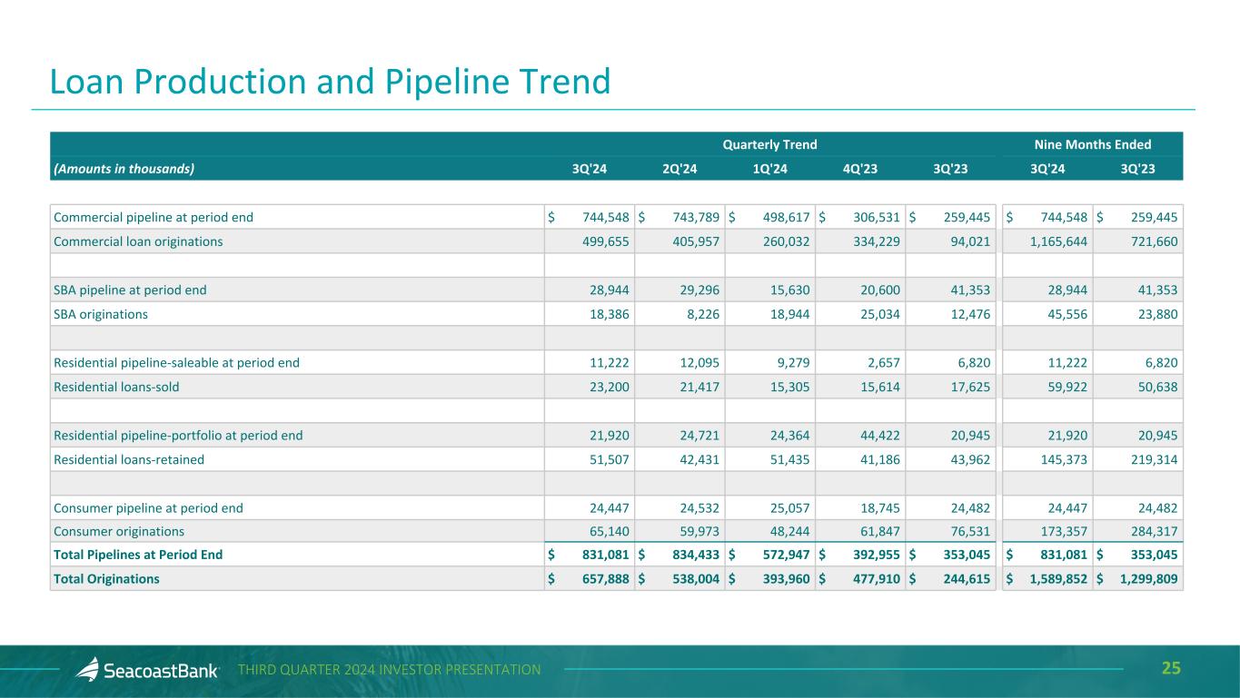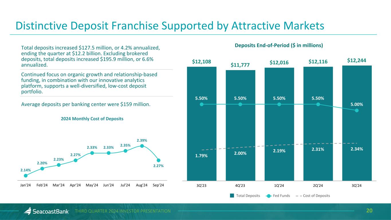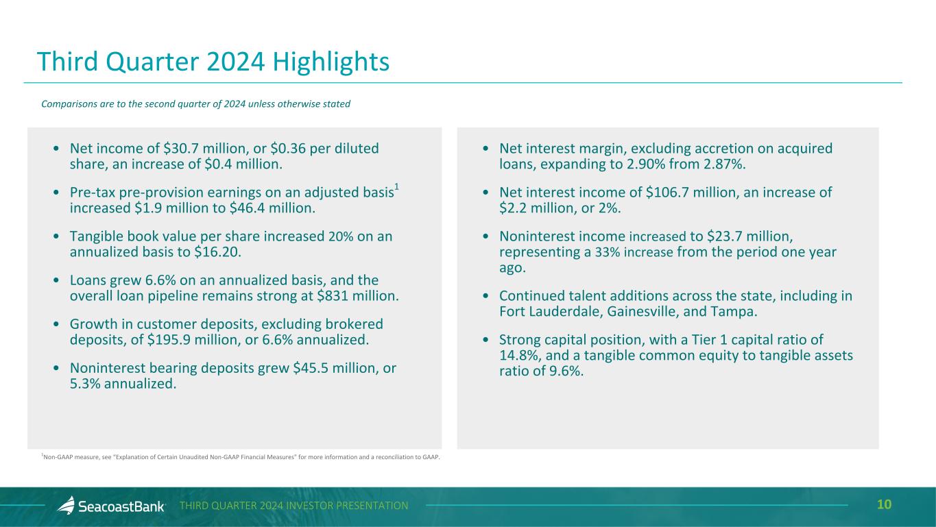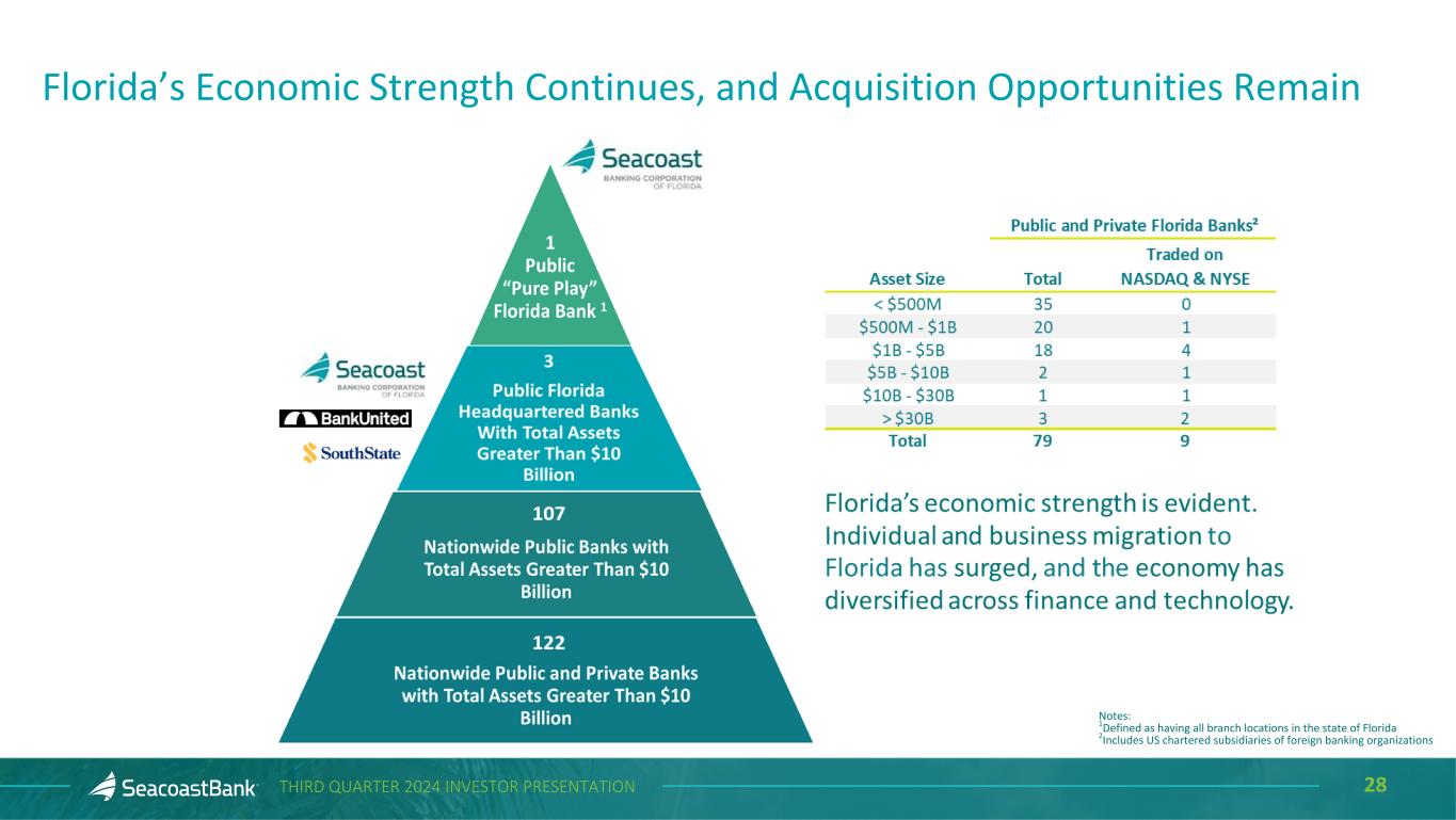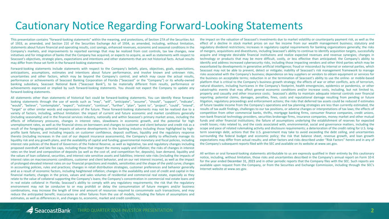 2THIRD QUARTER 2024 INVESTOR PRESENTATION Cautionary Notice Regarding Forward-Looking Statements This presentation contains “forward-looking statements” within the meaning, and protections, of Section 27A of the Securities Act of 1933, as amended, and Section 21E of the Securities Exchange Act of 1934, as amended, including, without limitation, statements about future financial and operating results, cost savings, enhanced revenues, economic and seasonal conditions in the Company’s markets, and improvements to reported earnings that may be realized from cost controls, tax law changes, new initiatives and for integration of banks that the Company has acquired, or expects to acquire, as well as statements with respect to Seacoast's objectives, strategic plans, expectations and intentions and other statements that are not historical facts. Actual results may differ from those set forth in the forward-looking statements. Forward-looking statements include statements with respect to the Company’s beliefs, plans, objectives, goals, expectations, anticipations, assumptions, estimates and intentions about future performance, and involve known and unknown risks, uncertainties and other factors, which may be beyond the Company’s control, and which may cause the actual results, performance or achievements of Seacoast Banking Corporation of Florida (“Seacoast” or the “Company”) or its wholly-owned banking subsidiary, Seacoast National Bank (“Seacoast Bank”), to be materially different from results, performance or achievements expressed or implied by such forward-looking statements. You should not expect the Company to update any forward-looking statements. All statements other than statements of historical fact could be forward-looking statements. You can identify these forward- looking statements through the use of words such as "may", "will", "anticipate", "assume", "should", "support", "indicate", "would", "believe", "contemplate", "expect", "estimate", "continue", "further", "plan", "point to", "project", "could", "intend", "target" or other similar words and expressions of the future. These forward-looking statements may not be realized due to a variety of factors, including, without limitation: the impact of current and future economic and market conditions generally (including seasonality) and in the financial services industry, nationally and within Seacoast’s primary market areas, including the effects of inflationary pressures, changes in interest rates, slowdowns in economic growth, and the potential for high unemployment rates, as well as the financial stress on borrowers and changes to customer and client behavior and credit risk as a result of the foregoing; potential impacts of adverse developments in the banking industry including those highlighted by high- profile bank failures, and including impacts on customer confidence, deposit outflows, liquidity and the regulatory response thereto (including increases in the cost of our deposit insurance assessments), the Company's ability to effectively manage its liquidity risk and any growth plans, and the availability of capital and funding; governmental monetary and fiscal policies, including interest rate policies of the Board of Governors of the Federal Reserve, as well as legislative, tax and regulatory changes including proposed overdraft and late fee caps, including those that impact the money supply and inflation; the risks of changes in interest rates on the level and composition of deposits (as well as the cost of, and competition for, deposits), loan demand, liquidity and the values of loan collateral, securities, and interest rate sensitive assets and liabilities; interest rate risks (including the impacts of interest rates on macroeconomic conditions, customer and client behavior, and on our net interest income), as well as the impact of prolonged elevated interest rates on our financial projections and models, sensitivities and the shape of the yield curve; changes in accounting policies, rules and practices; changes in retail distribution strategies, customer preferences and behavior generally and as a result of economic factors, including heightened inflation; changes in the availability and cost of credit and capital in the financial markets; changes in the prices, values and sales volumes of residential and commercial real estate, especially as they relate to the value of collateral supporting the Company’s loans; the Company’s concentration in commercial real estate loans and in real estate collateral in Florida; Seacoast’s ability to comply with any regulatory requirements; the risk that the regulatory environment may not be conducive to or may prohibit or delay the consummation of future mergers and/or business combinations, may increase the length of time and amount of resources required to consummate such transactions, and may reduce the anticipated benefit; inaccuracies or other failures from the use of models, including the failure of assumptions and estimates, as well as differences in, and changes to, economic, market and credit conditions; the impact on the valuation of Seacoast’s investments due to market volatility or counterparty payment risk, as well as the effect of a decline in stock market prices on our fee income from our wealth management business; statutory and regulatory dividend restrictions; increases in regulatory capital requirements for banking organizations generally; the risks of mergers, acquisitions and divestitures, including Seacoast’s ability to continue to identify acquisition targets, successfully acquire and integrate desirable financial institutions and realize expected revenues and revenue synergies; changes in technology or products that may be more difficult, costly, or less effective than anticipated; the Company’s ability to identify and address increased cybersecurity risks, including those impacting vendors and other third parties which may be 