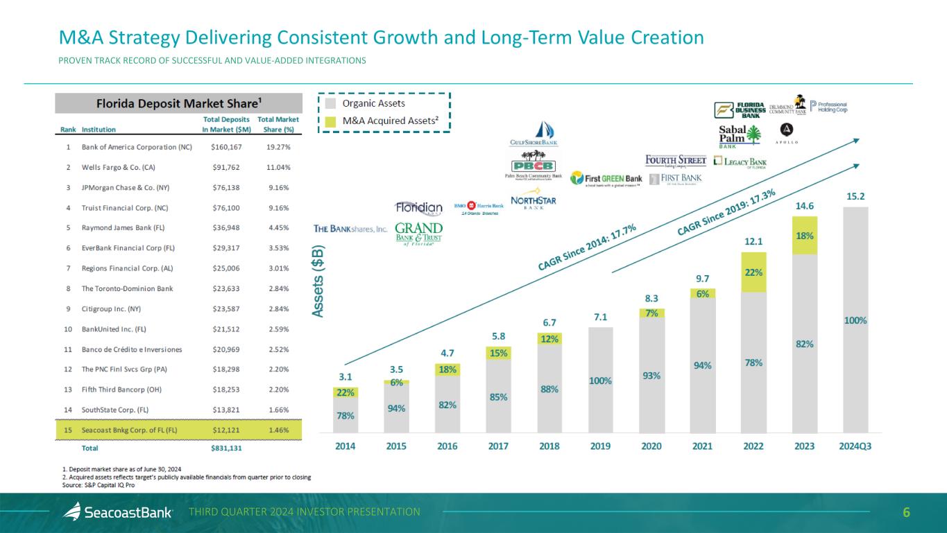5THIRD QUARTER 2024 INVESTOR PRESENTATION • Sustained, strong presence in Florida’s most attractive markets • #15 Florida market share ▪ #1 Florida-based bank in Orlando MSA ▪ #1 Florida-based bank in Palm Beach county ▪ #1 overall market share in Port St. Lucie MSA • Strong capital and liquidity position, supporting further organic growth and opportunistic acquisitions Valuable Florida Franchise with Strong Capital and Liquidity