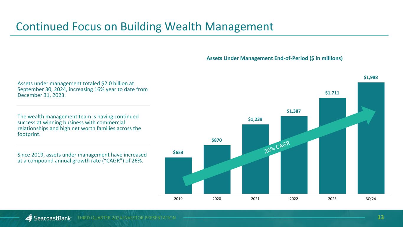 12THIRD QUARTER 2024 INVESTOR PRESENTATION Noninterest income increased $1.5 million from the prior quarter to $23.7 million, and adjusted noninterest income1 increased $1.3 million to $23.5 million. Changes from the prior quarter include: Service charges on deposits totaled $5.4 million, an increase of $0.1 million, or 1%. Our investments in talent and significant market expansion across the state have resulted in continued growth in treasury management services to commercial customers. Wealth management income totaled $3.8 million, an increase of $0.1 million, or 2%. The wealth management division continues to grow and add new relationships, with assets under management increasing 26% year over year to $2.0 billion at September 30, 2024. Insurance agency income totaled $1.4 million, an increase of 3% reflecting continued growth and expansion of services. SBA gains totaled $0.4 million, a decrease of $0.3 million, or 44%, due to lower saleable originations. Other income totaled $7.5 million, an increase of $1.5 million, or 26%, including gains on SBIC investments and higher swap-related fees. 1Non-GAAP measure, see “Explanation of Certain Unaudited Non-GAAP Financial Measures" for more information and a reconciliation to GAAP. Noninterest Income $18,180 $19,775 $20,268 $22,228 $23,492 $187 Adjusted noninterest income Securities gains (losses) 3Q'23 4Q'23 1Q'24 2Q'24 3Q'24 (In Thousands) $229 $(44)$(387) $(2,437) Noninterest income up 33% and adjusted noninterest income1, which excludes securities activity, up 29% year over year. 1