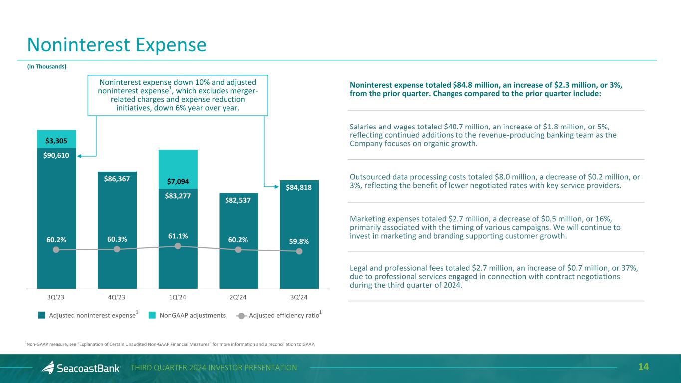 13THIRD QUARTER 2024 INVESTOR PRESENTATION Assets Under Management End-of-Period ($ in millions) $653 $870 $1,239 $1,387 $1,711 $1,988 2019 2020 2021 2022 2023 3Q'24 Continued Focus on Building Wealth Management Assets under management totaled $2.0 billion at September 30, 2024, increasing 16% year to date from December 31, 2023. The wealth management team is having continued success at winning business with commercial relationships and high net worth families across the footprint. Since 2019, assets under management have increased at a compound annual growth rate (“CAGR”) of 26%. 26% CAG R