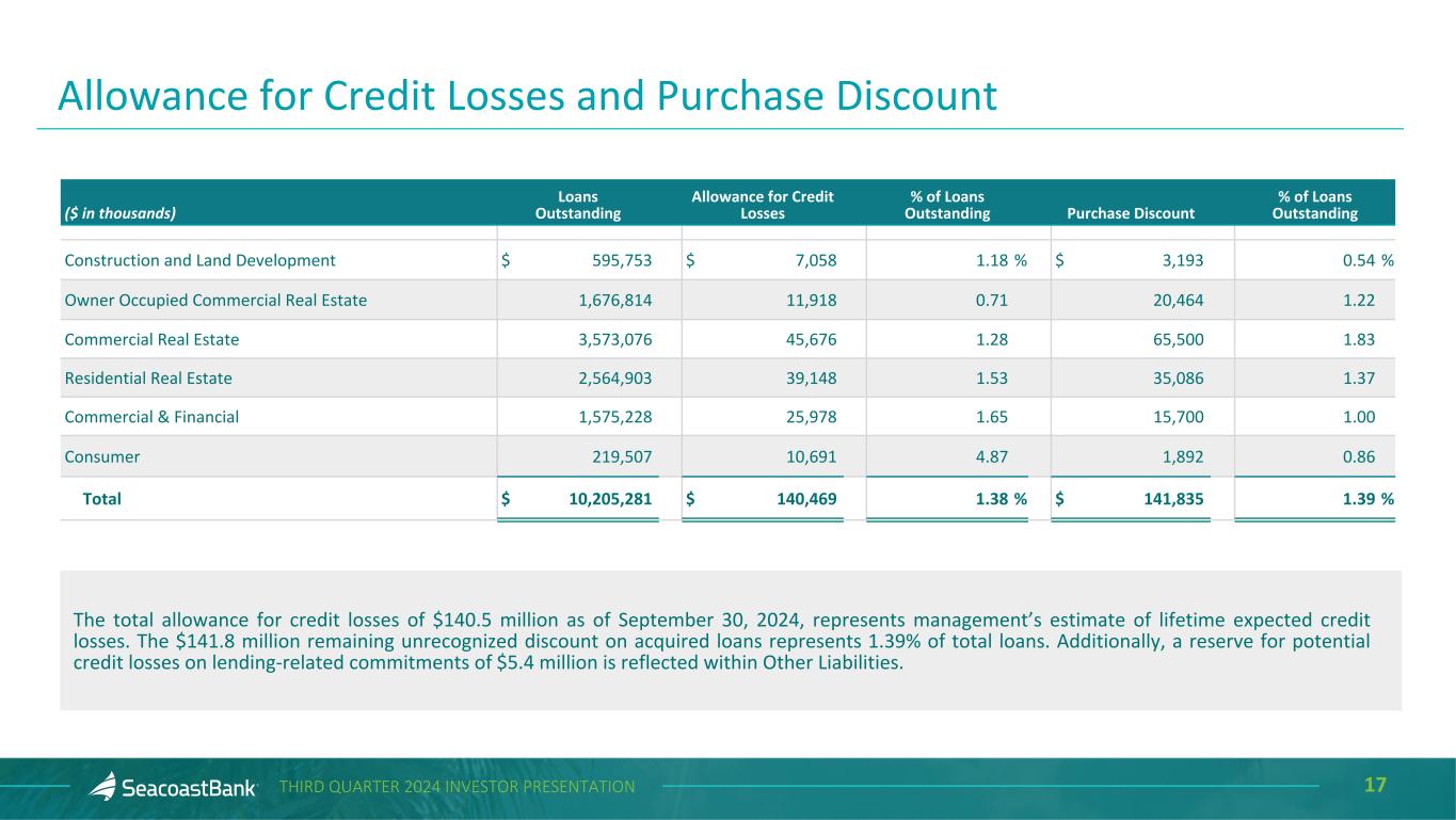 16THIRD QUARTER 2024 INVESTOR PRESENTATION At September 30, 2024 Loan Portfolio Mix Seacoast's lending strategy results in a diverse and granular loan portfolio. Seacoast’s average loan size is $360 thousand and the average commercial loan size is $789 thousand. Portfolio diversification in terms of asset mix, industry, and loan type, has been a critical element of the Company’s lending strategy. Exposures across industries and collateral types are broadly distributed. Construction and land development and commercial real estate loans, as defined in regulatory guidance, represent 34% and 227%, respectively, of total consolidated risk based capital. CRE-Retail, 11% CRE-Office, 6% CRE-Multifamily 5+, 4% CRE-Hotel/Motel, 4% CRE-Industrial/Warehouse, 4% CRE-Other, 6% OOCRE, 16% Construction & Land Development, 6% Commercial & Financial, 16% Residential, 25% Consumer, 2% Construction & Land Development and CRE Loans to Total Risk Based Capital 227% 251% 34% 57% CRE Construction & Land Development SBCF Peers Peer Source: 2Q’24 S&P Capital