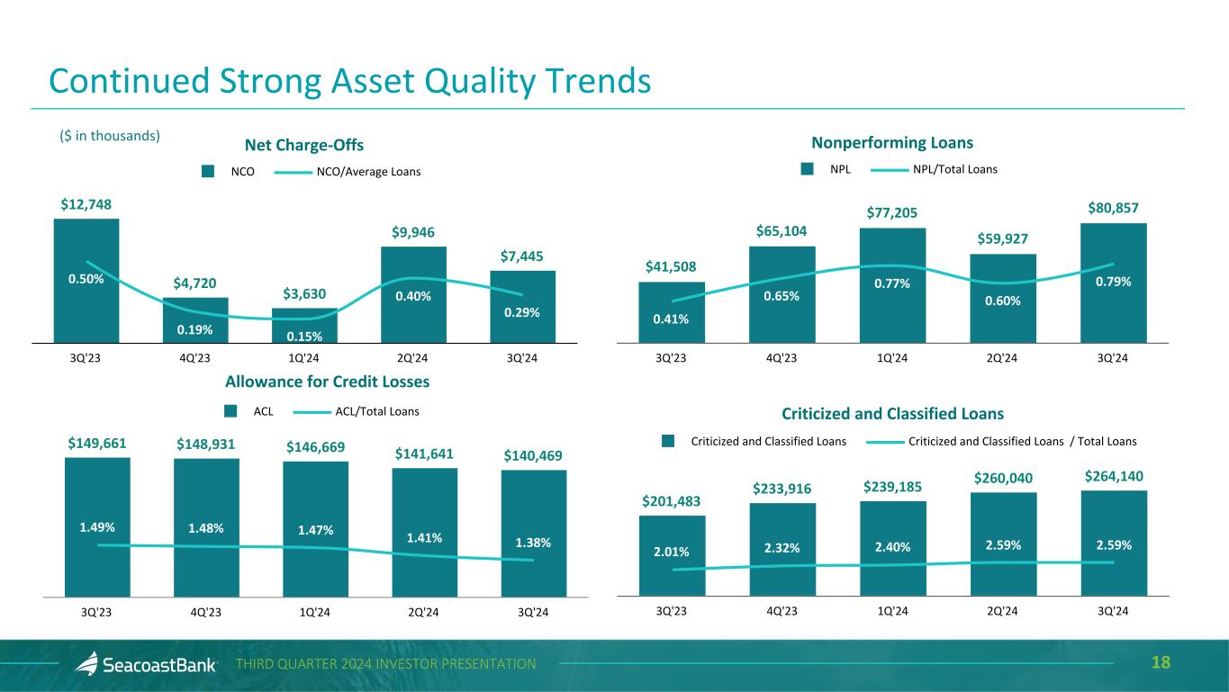 17THIRD QUARTER 2024 INVESTOR PRESENTATION Allowance for Credit Losses and Purchase Discount ($ in thousands) Loans Outstanding Allowance for Credit Losses % of Loans Outstanding Purchase Discount % of Loans Outstanding Construction and Land Development $ 595,753 $ 7,058 1.18 % $ 3,193 0.54 % Owner Occupied Commercial Real Estate 1,676,814 11,918 0.71 20,464 1.22 Commercial Real Estate 3,573,076 45,676 1.28 65,500 1.83 Residential Real Estate 2,564,903 39,148 1.53 35,086 1.37 Commercial & Financial 1,575,228 25,978 1.65 15,700 1.00 Consumer 219,507 10,691 4.87 1,892 0.86 Total $ 10,205,281 $ 140,469 1.38 % $ 141,835 1.39 % The total allowance for credit losses of $140.5 million as of September 30, 2024, represents management’s estimate of lifetime expected credit losses. The $141.8 million remaining unrecognized discount on acquired loans represents 1.39% of total loans. Additionally, a reserve for potential credit losses on lending-related commitments of $5.4 million is reflected within Other Liabilities.