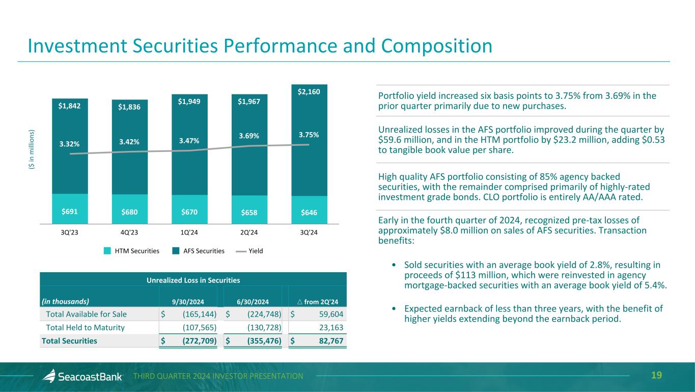 18THIRD QUARTER 2024 INVESTOR PRESENTATION Net Charge-Offs $12,748 $4,720 $3,630 $9,946 $7,445 0.50% 0.19% 0.15% 0.40% 0.29% NCO NCO/Average Loans 3Q'23 4Q'23 1Q'24 2Q'24 3Q'24 ($ in thousands) $149,661 $148,931 $146,669 $141,641 $140,469 1.49% 1.48% 1.47% 1.41% 1.38% ACL ACL/Total Loans 3Q'23 4Q'23 1Q'24 2Q'24 3Q'24 Allowance for Credit Losses Continued Strong Asset Quality Trends Nonperforming Loans $41,508 $65,104 $77,205 $59,927 $80,857 0.41% 0.65% 0.77% 0.60% 0.79% NPL NPL/Total Loans 3Q'23 4Q'23 1Q'24 2Q'24 3Q'24 Criticized and Classified Loans $201,483 $233,916 $239,185 $260,040 $264,140 2.01% 2.32% 2.40% 2.59% 2.59% Criticized and Classified Loans Criticized and Classified Loans / Total Loans 3Q'23 4Q'23 1Q'24 2Q'24 3Q'24