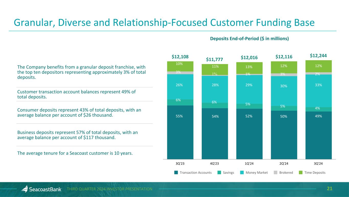 20THIRD QUARTER 2024 INVESTOR PRESENTATION Deposits End-of-Period ($ in millions) $12,108 $11,777 $12,016 $12,116 $12,244 5.50% 5.50% 5.50% 5.50% 5.00% 1.79% 2.00% 2.19% 2.31% 2.34% Total Deposits Fed Funds Cost of Deposits 3Q'23 4Q'23 1Q'24 2Q'24 3Q'24 Distinctive Deposit Franchise Supported by Attractive Markets Total deposits increased $127.5 million, or 4.2% annualized, ending the quarter at $12.2 billion. Excluding brokered deposits, total deposits increased $195.9 million, or 6.6% annualized. Continued focus on organic growth and relationship-based funding, in combination with our innovative analytics platform, supports a well-diversified, low-cost deposit portfolio. Average deposits per banking center were $159 million. 2024 Monthly Cost of Deposits 2.14% 2.20% 2.23% 2.27% 2.33% 2.33% 2.35% 2.39% 2.27% Jan'24 Feb'24 Mar'24 Apr'24 May'24 Jun'24 Jul'24 Aug'24 Sep'24