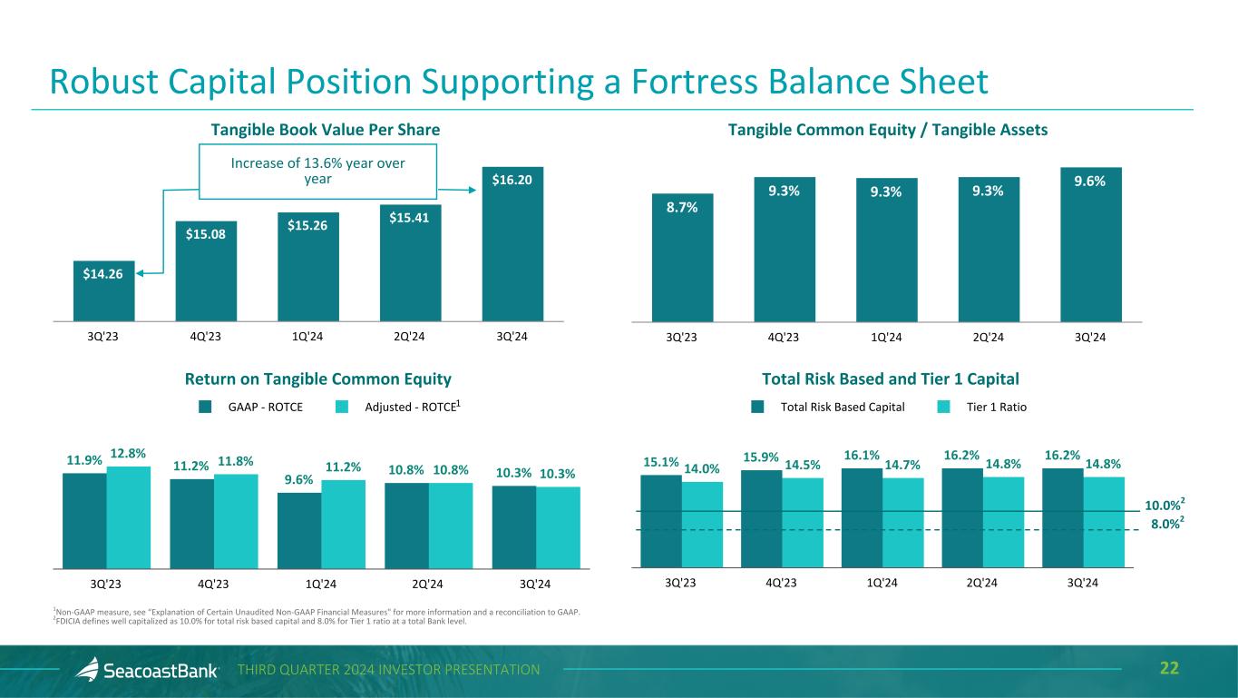 21THIRD QUARTER 2024 INVESTOR PRESENTATION Deposits End-of-Period ($ in millions) $12,108 $11,777 $12,016 $12,116 $12,244 Transaction Accounts Savings Money Market Brokered Time Deposits 3Q'23 4Q'23 1Q'24 2Q'24 3Q'24 Granular, Diverse and Relationship-Focused Customer Funding Base The Company benefits from a granular deposit franchise, with the top ten depositors representing approximately 3% of total deposits. Customer transaction account balances represent 49% of total deposits. Consumer deposits represent 43% of total deposits, with an average balance per account of $26 thousand. Business deposits represent 57% of total deposits, with an average balance per account of $117 thousand. The average tenure for a Seacoast customer is 10 years. 49%50%52%54%55% 4%5%5%6%6% 26% 28% 29% 30% 33% 3% 1% 1% 3% 2% 10% 11% 13% 12% 12%