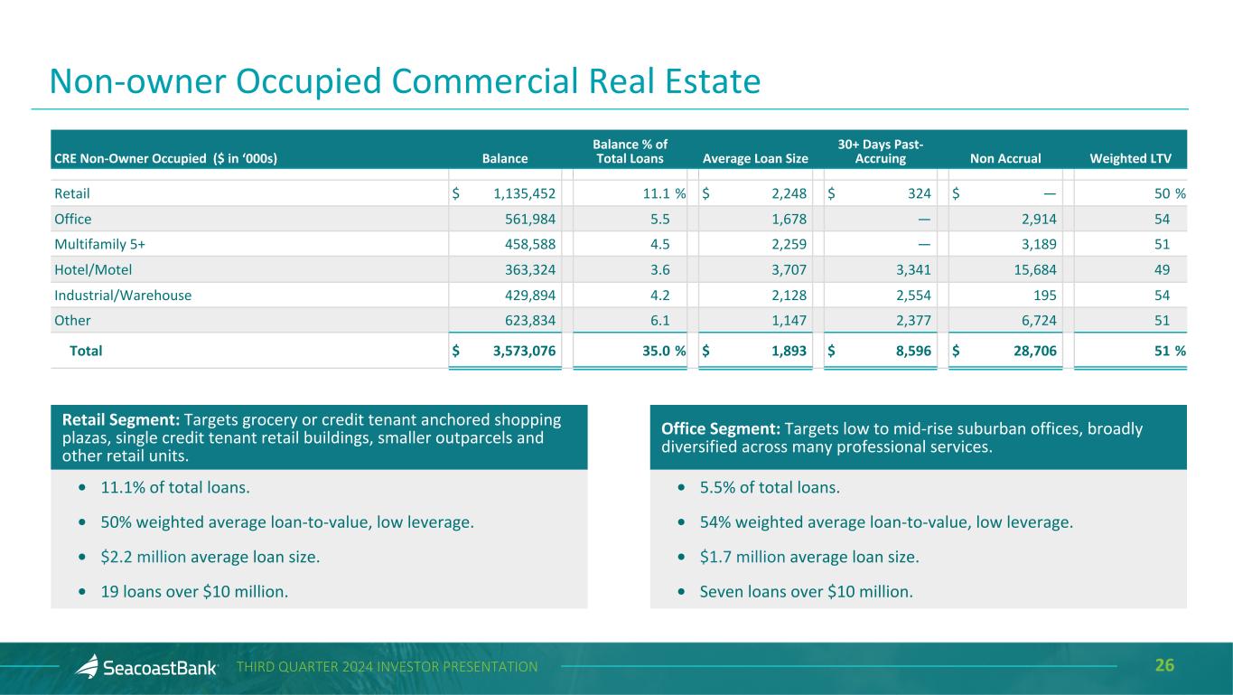 25THIRD QUARTER 2024 INVESTOR PRESENTATION Quarterly Trend Nine Months Ended (Amounts in thousands) 3Q'24 2Q'24 1Q'24 4Q'23 3Q'23 3Q'24 3Q'23 Commercial pipeline at period end $ 744,548 $ 743,789 $ 498,617 $ 306,531 $ 259,445 $ 744,548 $ 259,445 Commercial loan originations 499,655 405,957 260,032 334,229 94,021 1,165,644 721,660 SBA pipeline at period end 28,944 29,296 15,630 20,600 41,353 28,944 41,353 SBA originations 18,386 8,226 18,944 25,034 12,476 45,556 23,880 Residential pipeline-saleable at period end 11,222 12,095 9,279 2,657 6,820 11,222 6,820 Residential loans-sold 23,200 21,417 15,305 15,614 17,625 59,922 50,638 Residential pipeline-portfolio at period end 21,920 24,721 24,364 44,422 20,945 21,920 20,945 Residential loans-retained 51,507 42,431 51,435 41,186 43,962 145,373 219,314 Consumer pipeline at period end 24,447 24,532 25,057 18,745 24,482 24,447 24,482 Consumer originations 65,140 59,973 48,244 61,847 76,531 173,357 284,317 Total Pipelines at Period End $ 831,081 $ 834,433 $ 572,947 $ 392,955 $ 353,045 $ 831,081 $ 353,045 Total Originations $ 657,888 $ 538,004 $ 393,960 $ 477,910 $ 244,615 $ 1,589,852 $ 1,299,809 Loan Production and Pipeline Trend