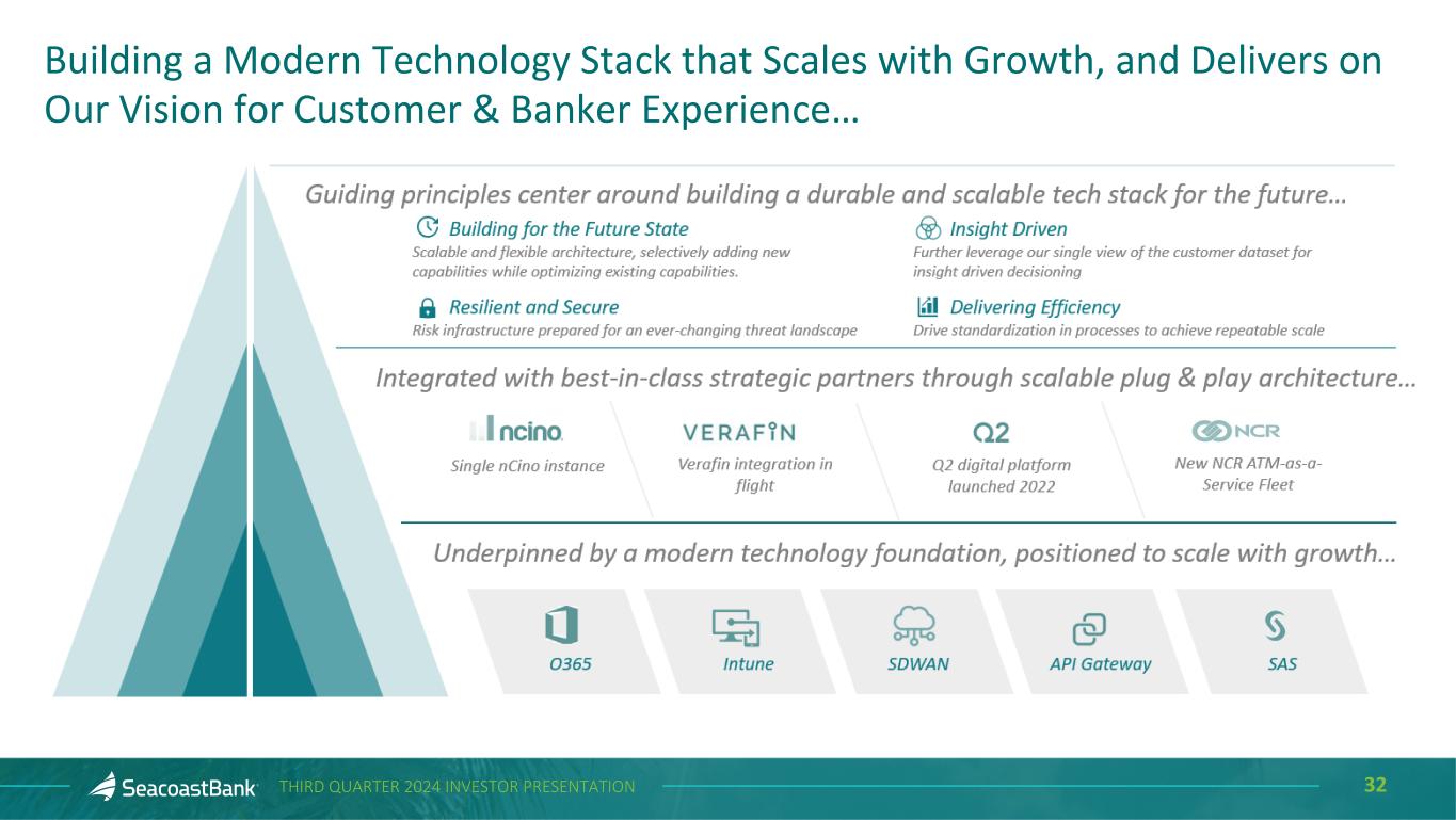 31THIRD QUARTER 2024 INVESTOR PRESENTATION Improved Digital Capabilities and User Experience Continue to Drive Satisfaction and Greater Adoption Across User Base Increase in digital account origination compared to prior year The digital platform continues to grow in adoption and transaction volume across multiple capabilities, broadening customer relationships through value added experiences. Digital account origination continues to contribute to organic growth in 2024 with multiple initiatives driving volume into this origination channel. Customer satisfaction has improved, as demonstrated by digital surveys and app store reviews. App store reviews show improved satisfaction 69% of digital sessions are from mobile devices 4.3 Star Rated App Digital Account Origination and Platform Adoption 31% 58% Increase in Zelle® Transactions YoY 39% Increase in Personal Financial Management Adoption YoY