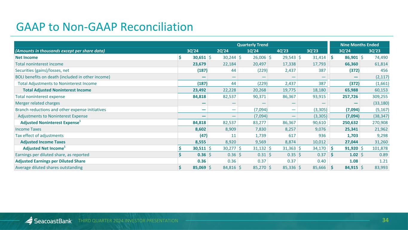 33THIRD QUARTER 2024 INVESTOR PRESENTATION This presentation contains financial information determined by methods other than Generally Accepted Accounting Principles (“GAAP”). The financial highlights provide reconciliations between GAAP and adjusted financial measures including net income, noninterest income, noninterest expense, tax adjustments and other financial ratios. Management uses these non-GAAP financial measures in its analysis of the Company’s performance and believes these presentations provide useful supplemental information, and a clearer understanding of the Company’s performance. The Company believes the non-GAAP measures enhance investors’ understanding of the Company’s business and performance and if not provided would be requested by the investor community. These measures are also useful in understanding performance trends and facilitate comparisons with the performance of other financial institutions. The limitations associated with operating measures are the risk that persons might disagree as to the appropriateness of items comprising these measures and that different companies might define or calculate these measures differently. The Company provides reconciliations between GAAP and these non-GAAP measures. These disclosures should not be considered an alternative to GAAP. Explanation of Certain Unaudited Non-GAAP Financial Measures