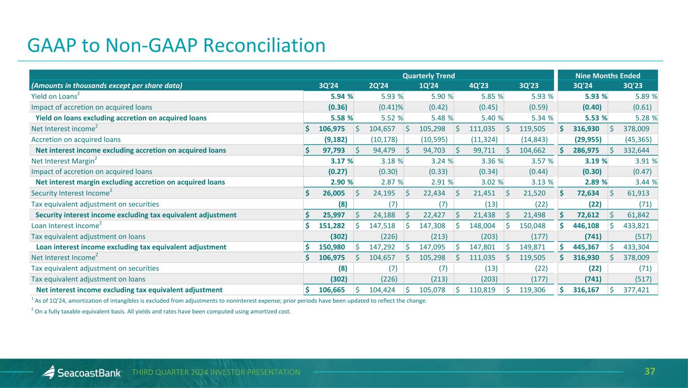 36THIRD QUARTER 2024 INVESTOR PRESENTATION Quarterly Trend Nine Months Ended (Amounts in thousands except per share data) 3Q'24 2Q'24 1Q'24 4Q'23 3Q'23 3Q'24 3Q'23 Average Assets $ 14,996,846 $ 14,839,707 $ 14,690,776 $ 14,738,034 $ 14,906,003 $ 14,843,007 $ 14,583,932 Less average goodwill and intangible assets (812,761) (818,914) (825,531) (832,029) (839,787) (819,046) (811,483) Average Tangible Assets $ 14,184,085 $ 14,020,793 $ 13,865,245 $ 13,906,005 $ 14,066,216 $ 14,023,961 $ 13,772,449 Return on Average Assets (ROA) 0.81 % 0.82 % 0.71 % 0.80 % 0.84 % 0.78 % 0.68 % Impact of removing average intangible assets and related amortization 0.18 0.18 0.18 0.19 0.20 0.18 0.20 Return on Average Tangible Assets (ROTA) 0.99 1.00 0.89 0.99 1.04 0.96 0.88 Impact of other adjustments for Adjusted Net Income (0.01) — 0.15 0.05 0.08 0.05 0.27 Adjusted Return on Average Tangible Assets 0.98 1.00 1.04 1.04 1.12 1.01 1.15 Pre-Tax Pre-Provision return on Average Tangible Assets1 1.46 % 1.45 % 1.22 % 1.39 % 1.43 % 1.38 % 1.49 % Impact of adjustments on Pre-Tax Pre-Provision earnings 0.01 — 0.20 0.09 0.12 0.06 0.36 Adjusted Pre-Tax Pre-Provision Return on Tangible Assets1 1.47 1.45 1.42 1.48 1.55 1.44 1.85 Average Shareholders' Equity $ 2,168,444 $ 2,117,628 $ 2,118,381 $ 2,058,912 $ 2,072,747 $ 2,134,941 $ 2,014,083 Less average goodwill and intangible assets (812,761) (818,914) (825,531) (832,029) (839,787) (819,046) (811,483) Average Tangible Equity $ 1,355,683 $ 1,298,714 $ 1,292,850 $ 1,226,883 $ 1,232,960 $ 1,315,895 $ 1,202,600 Return on Average Shareholders' Equity 5.62 % 5.74 % 4.94 % 5.69 % 6.01 % 5.44 % 4.94 % Impact of removing average intangible assets and related amortization 4.69 5.01 4.61 5.53 5.89 4.77 5.15 Return on Average Tangible Common Equity (ROTCE) 10.31 10.75 9.55 11.22 11.90 10.21 10.09 Impact of other adjustments for Adjusted Net Income (0.04) 0.01 1.60 0.58 0.89 0.51 3.05 Adjusted Return on Average Tangible Common Equity 10.27 % 10.76 % 11.15 % 11.80 % 12.79 % 10.72 % 13.14 % Loan Interest Income2 $ 151,282 $ 147,518 $ 147,308 $ 148,004 $ 150,048 $ 446,108 $ 433,821 Accretion on acquired loans (9,182) (10,178) (10,595) (11,324) (14,843) (29,955) (45,365) Loan interest income excluding accretion on acquired loans $ 142,100 $ 137,340 $ 136,713 $ 136,680 $ 135,205 $ 416,153 $ 388,456 GAAP to Non-GAAP Reconciliation