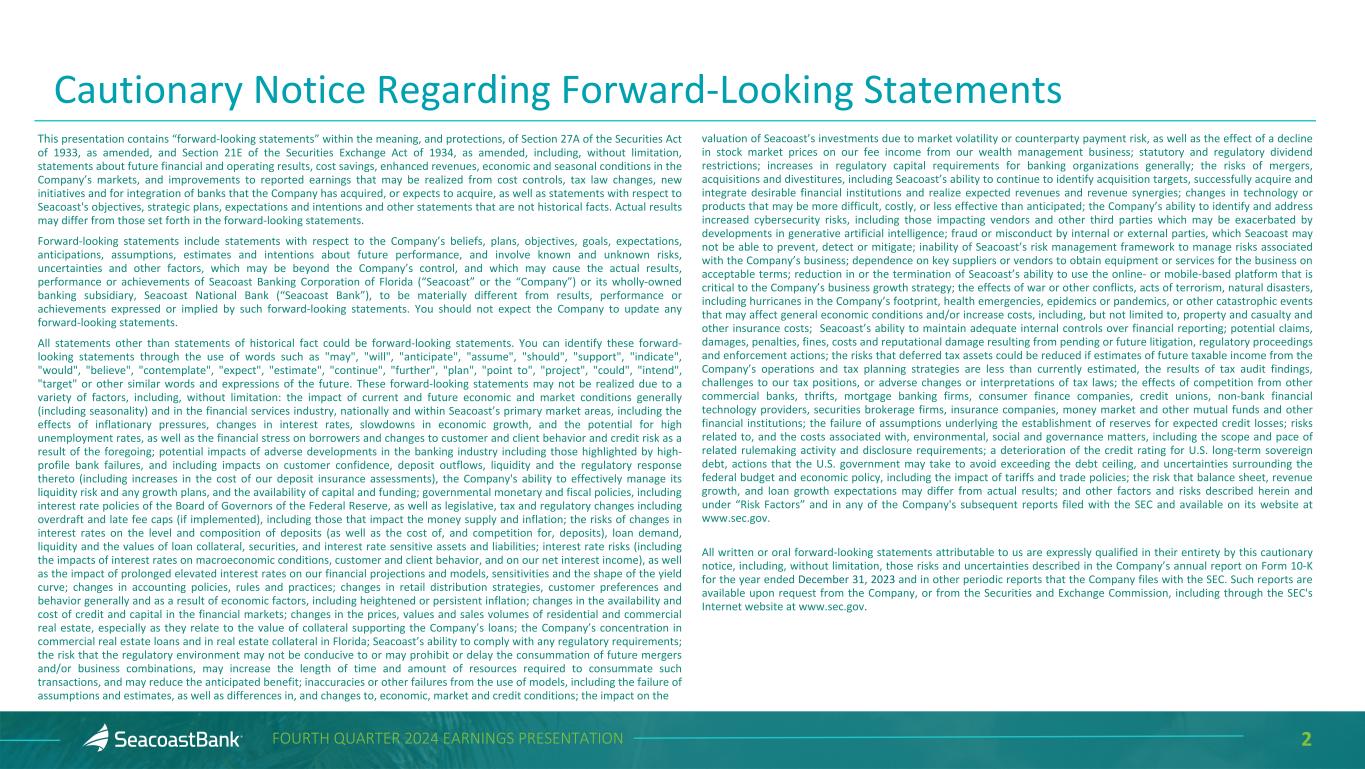 2FOURTH QUARTER 2024 EARNINGS PRESENTATION Cautionary Notice Regarding Forward-Looking Statements This presentation contains “forward-looking statements” within the meaning, and protections, of Section 27A of the Securities Act of 1933, as amended, and Section 21E of the Securities Exchange Act of 1934, as amended, including, without limitation, statements about future financial and operating results, cost savings, enhanced revenues, economic and seasonal conditions in the Company’s markets, and improvements to reported earnings that may be realized from cost controls, tax law changes, new initiatives and for integration of banks that the Company has acquired, or expects to acquire, as well as statements with respect to Seacoast's objectives, strategic plans, expectations and intentions and other statements that are not historical facts. Actual results may differ from those set forth in the forward-looking statements. Forward-looking statements include statements with respect to the Company’s beliefs, plans, objectives, goals, expectations, anticipations, assumptions, estimates and intentions about future performance, and involve known and unknown risks, uncertainties and other factors, which may be beyond the Company’s control, and which may cause the actual results, performance or achievements of Seacoast Banking Corporation of Florida (“Seacoast” or the “Company”) or its wholly-owned banking subsidiary, Seacoast National Bank (“Seacoast Bank”), to be materially different from results, performance or achievements expressed or implied by such forward-looking statements. You should not expect the Company to update any forward-looking statements. All statements other than statements of historical fact could be forward-looking statements. You can identify these forward- looking statements through the use of words such as "may", "will", "anticipate", "assume", "should", "support", "indicate", "would", "believe", "contemplate", "expect", "estimate", "continue", "further", "plan", "point to", "project", "could", "intend", "target" or other similar words and expressions of the future. These forward-looking statements may not be realized due to a variety of factors, including, without limitation: the impact of current and future economic and market conditions generally (including seasonality) and in the financial services industry, nationally and within Seacoast’s primary market areas, including the effects of inflationary pressures, changes in interest rates, slowdowns in economic growth, and the potential for high unemployment rates, as well as the financial stress on borrowers and changes to customer and client behavior and credit risk as a result of the foregoing; potential impacts of adverse developments in the banking industry including those highlighted by high- profile bank failures, and including impacts on customer confidence, deposit outflows, liquidity and the regulatory response thereto (including increases in the cost of our deposit insurance assessments), the Company's ability to effectively manage its liquidity risk and any growth plans, and the availability of capital and funding; governmental monetary and fiscal policies, including interest rate policies of the Board of Governors of the Federal Reserve, as well as legislative, tax and regulatory changes including overdraft and late fee caps (if implemented), including those that impact the money supply and inflation; the risks of changes in interest rates on the level and composition of deposits (as well as the cost of, and competition for, deposits), loan demand, liquidity and the values of loan collateral, securities, and interest rate sensitive assets and liabilities; interest rate risks (including the impacts of interest rates on macroeconomic conditions, customer and client behavior, and on our net interest income), as well as the impact of prolonged elevated interest rates on our financial projections and models, sensitivities and the shape of the yield curve; changes in accounting policies, rules and practices; changes in retail distribution strategies, customer preferences and behavior generally and as a result of economic factors, including heightened or persistent inflation; changes in the availability and cost of credit and capital in the financial markets; changes in the prices, values and sales volumes of residential and commercial real estate, especially as they relate to the value of collateral supporting the Company’s loans; the Company’s concentration in commercial real estate loans and in real estate collateral in Florida; Seacoast’s ability to comply with any regulatory requirements; the risk that the regulatory environment may not be conducive to or may prohibit or delay the consummation of future mergers and/or business combinations, may increase the length of time and amount of resources required to consummate such transactions, and may reduce the anticipated benefit; inaccuracies or other failures from the use of models, including the failure of assumptions and estimates, as well as differences in, and changes to, economic, market and credit conditions; the impact on the valuation of Seacoast’s investments due to market volatility or counterparty payment risk, as well as the effect of a decline in stock market prices on our fee income from our wealth management business; statutory and regulatory dividend restrictions; increases in regulatory capital requirements for banking organizations generally; the risks of mergers, acquisitions and divestitures, including Seacoast’s ability to continue to identify acquisition targets, successfully acquire and integrate desirable financial institutions and realize expected revenues and revenue synergies; changes in technology or products that may be more difficult, costly, or less effective than anticipated; the Company’s ability to identify and address increased cybersecurity risks, including those impacting vendors and other thir