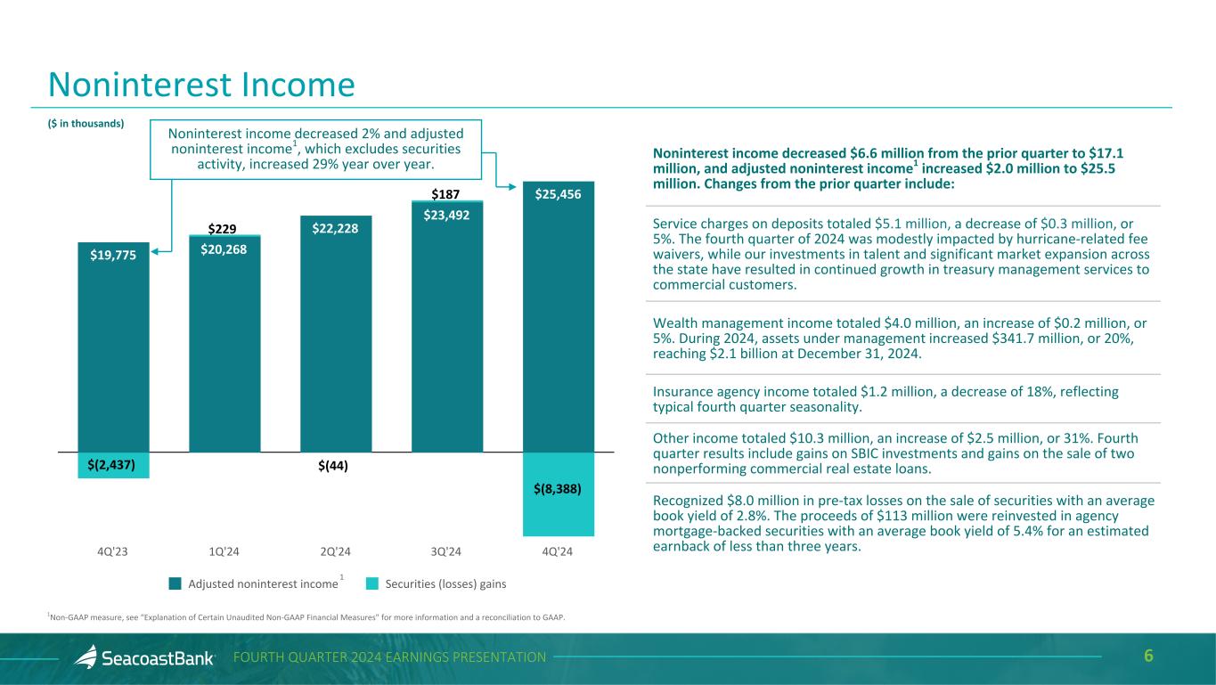 6FOURTH QUARTER 2024 EARNINGS PRESENTATION Noninterest income decreased $6.6 million from the prior quarter to $17.1 million, and adjusted noninterest income1 increased $2.0 million to $25.5 million. Changes from the prior quarter include: Service charges on deposits totaled $5.1 million, a decrease of $0.3 million, or 5%. The fourth quarter of 2024 was modestly impacted by hurricane-related fee waivers, while our investments in talent and significant market expansion across the state have resulted in continued growth in treasury management services to commercial customers. Wealth management income totaled $4.0 million, an increase of $0.2 million, or 5%. During 2024, assets under management increased $341.7 million, or 20%, reaching $2.1 billion at December 31, 2024. Insurance agency income totaled $1.2 million, a decrease of 18%, reflecting typical fourth quarter seasonality. Other income totaled $10.3 million, an increase of $2.5 million, or 31%. Fourth quarter results include gains on SBIC investments and gains on the sale of two nonperforming commercial real estate loans. Recognized $8.0 million in pre-tax losses on the sale of securities with an average book yield of 2.8%. The proceeds of $113 million were reinvested in agency mortgage-backed securities with an average book yield of 5.4% for an estimated earnback of less than three years. 1Non-GAAP measure, see “Explanation of Certain Unaudited Non-GAAP Financial Measures" for more information and a reconciliation to GAAP. Noninterest Income $19,775 $20,268 $22,228 $23,492 $25,456 Adjusted noninterest income Securities (losses) gains 4Q'23 1Q'24 2Q'24 3Q'24 4Q'24 ($ in thousands) $229 $(44)$(2,437) Noninterest income decreased 2% and adjusted noninterest income1, which excludes securities activity, increased 29% year over year. 1 $187 $(8,388)