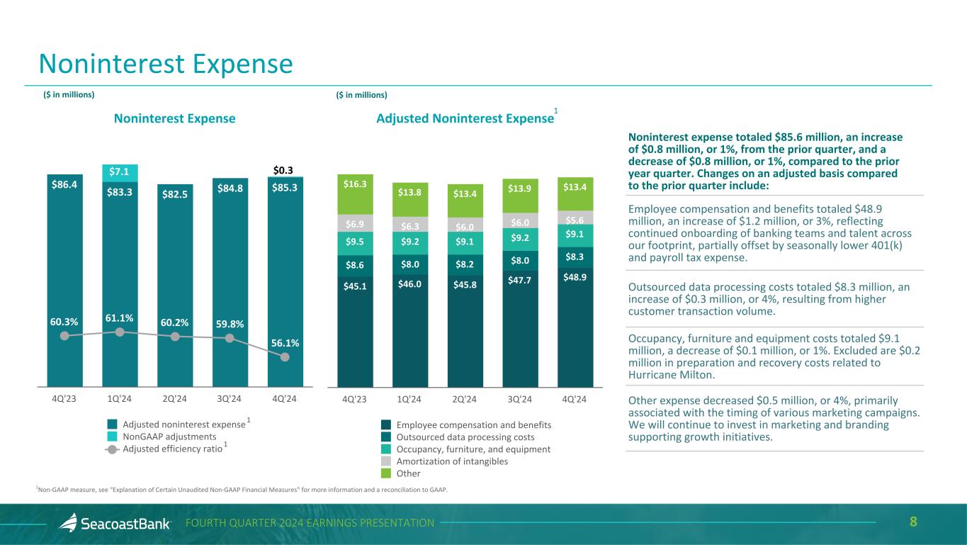 8FOURTH QUARTER 2024 EARNINGS PRESENTATION Noninterest Expense Noninterest expense totaled $85.6 million, an increase of $0.8 million, or 1%, from the prior quarter, and a decrease of $0.8 million, or 1%, compared to the prior year quarter. Changes on an adjusted basis compared to the prior quarter include: Employee compensation and benefits totaled $48.9 million, an increase of $1.2 million, or 3%, reflecting continued onboarding of banking teams and talent across our footprint, partially offset by seasonally lower 401(k) and payroll tax expense. Outsourced data processing costs totaled $8.3 million, an increase of $0.3 million, or 4%, resulting from higher customer transaction volume. Occupancy, furniture and equipment costs totaled $9.1 million, a decrease of $0.1 million, or 1%. Excluded are $0.2 million in preparation and recovery costs related to Hurricane Milton. Other expense decreased $0.5 million, or 4%, primarily associated with the timing of various marketing campaigns. We will continue to invest in marketing and branding supporting growth initiatives. Noninterest Expense $86.4 $83.3 $82.5 $84.8 $85.3 $7.1 60.3% 61.1% 60.2% 59.8% 56.1% Adjusted noninterest expense NonGAAP adjustments Adjusted efficiency ratio 4Q'23 1Q'24 2Q'24 3Q'24 4Q'24 ($ in millions) 1Non-GAAP measure, see “Explanation of Certain Unaudited Non-GAAP Financial Measures" for more information and a reconciliation to GAAP. 1 Adjusted Noninterest Expense $45.1 $46.0 $45.8 $47.7 $48.9 $8.6 $8.0 $8.2 $8.0 $8.3 $9.5 $9.2 $9.1 $9.2 $9.1 $6.9 $6.3 $6.0 $6.0 $5.6 $16.3 $13.8 $13.4 $13.9 $13.4 Employee compensation and benefits Outsourced data processing costs Occupancy, furniture, and equipment Amortization of intangibles Other 4Q'23 1Q'24 2Q'24 3Q'24 4Q'24 $0.3 ($ in millions) 1 1