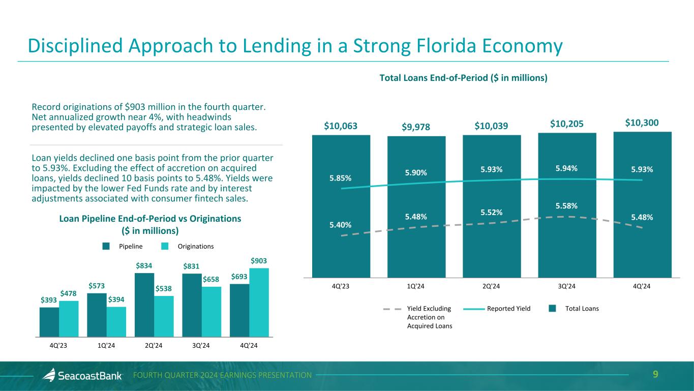 9FOURTH QUARTER 2024 EARNINGS PRESENTATION $393 $573 $834 $831 $693 $478 $394 $538 $658 $903 Pipeline Originations 4Q'23 1Q'24 2Q'24 3Q'24 4Q'24 Loan Pipeline End-of-Period vs Originations ($ in millions) $10,063 $9,978 $10,039 $10,205 $10,300 5.85% 5.90% 5.93% 5.94% 5.93% 5.40% 5.48% 5.52% 5.58% 5.48% Yield Excluding Accretion on Acquired Loans Reported Yield Total Loans 4Q'23 1Q'24 2Q'24 3Q'24 4Q'24 Total Loans End-of-Period ($ in millions) Disciplined Approach to Lending in a Strong Florida Economy Record originations of $903 million in the fourth quarter. Net annualized growth near 4%, with headwinds presented by elevated payoffs and strategic loan sales. Loan yields declined one basis point from the prior quarter to 5.93%. Excluding the effect of accretion on acquired loans, yields declined 10 basis points to 5.48%. Yields were impacted by the lower Fed Funds rate and by interest adjustments associated with consumer fintech sales.