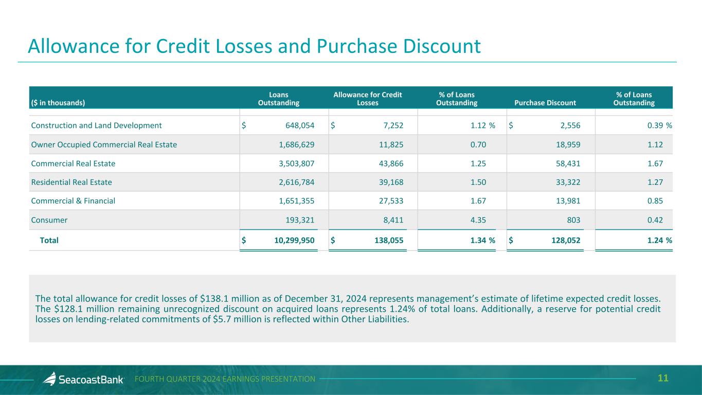 10FOURTH QUARTER 2024 EARNINGS PRESENTATION At December 31, 2024 Loan Portfolio Mix Seacoast's lending strategy results in a diverse and granular loan portfolio. Seacoast’s average loan size is $383 thousand and the average commercial loan size is $814 thousand. Portfolio diversification in terms of asset mix, industry, and loan type, has been a critical element of the Company’s lending strategy. Exposures across industries and collateral types are broadly distributed. Construction and land development and commercial real estate loans, as defined in regulatory guidance, represent 36% and 224%, respectively, of total consolidated risk based capital1. CRE-Retail, 12% CRE-Office, 6% CRE-Multifamily 5+, 4% CRE-Hotel/Motel, 3% CRE-Industrial/Warehouse, 4% CRE-Other, 6% OOCRE, 16% Construction & Land Development, 6% Commercial & Financial, 16% Residential, 25% Consumer, 2% 1Estimated