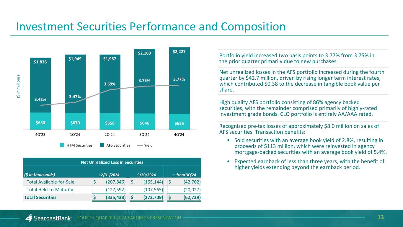 12FOURTH QUARTER 2024 EARNINGS PRESENTATION Net Charge-Offs $4,720 $3,630 $9,946 $7,445 $6,113 0.19% 0.15% 0.40% 0.29% 0.24% NCO NCO/Average Loans 4Q'23 1Q'24 2Q'24 3Q'24 4Q'24 ($ in thousands) $148,931 $146,669 $141,641 $140,469 $138,055 1.48% 1.47% 1.41% 1.38% 1.34% ACL ACL/Total Loans 4Q'23 1Q'24 2Q'24 3Q'24 4Q'24 Allowance for Credit Losses Continued Strong Asset Quality Trends Nonperforming Loans $65,104 $77,205 $59,927 $80,857 $92,446 0.65% 0.77% 0.60% 0.79% 0.90% 0.30% 0.30% 0.39% 0.50% 0.15% NPL NPL/Total Loans Accruing Past Due / Total Loans 4Q'23 1Q'24 2Q'24 3Q'24 4Q'24 Criticized and Classified Loans $233,916 $239,185 $260,040 $264,140 $223,859 2.32% 2.40% 2.59% 2.59% 2.17% Criticized and Classified Loans Criticized and Classified Loans / Total Loans 4Q'23 1Q'24 2Q'24 3Q'24 4Q'24