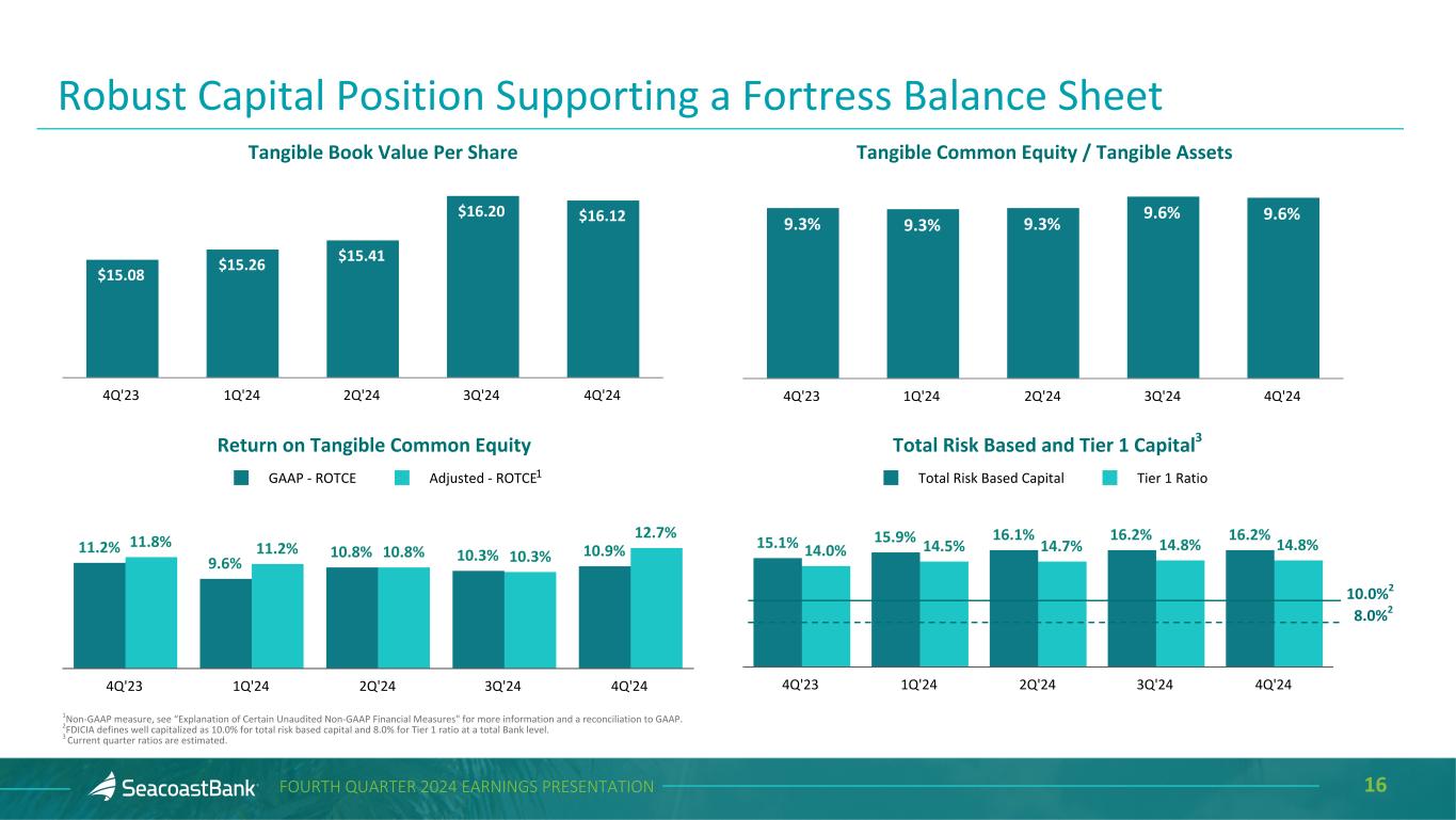15FOURTH QUARTER 2024 EARNINGS PRESENTATION Deposits End-of-Period ($ in millions) $11,777 $12,016 $12,116 $12,244 $12,242 Transaction Accounts Savings Money Market Brokered Time Deposits 4Q'23 1Q'24 2Q'24 3Q'24 4Q'24 Granular, Diverse and Relationship-Focused Customer Funding Base The Company benefits from a granular deposit franchise, with the top ten depositors representing approximately 4% of total deposits. Customer transaction account balances represent 50% of total deposits. Consumer deposits represent 41% of total deposits, with an average balance per account of $25 thousand. Business deposits represent 59% of total deposits, with an average balance per account of $112 thousand. The average tenure for a Seacoast customer is 10 years. 50%49%50%52%54% 4%4%5%5%6% 28% 29% 30% 33% 33% 1% 1% 3% 2% 2% 11% 13% 12% 12% 11%
