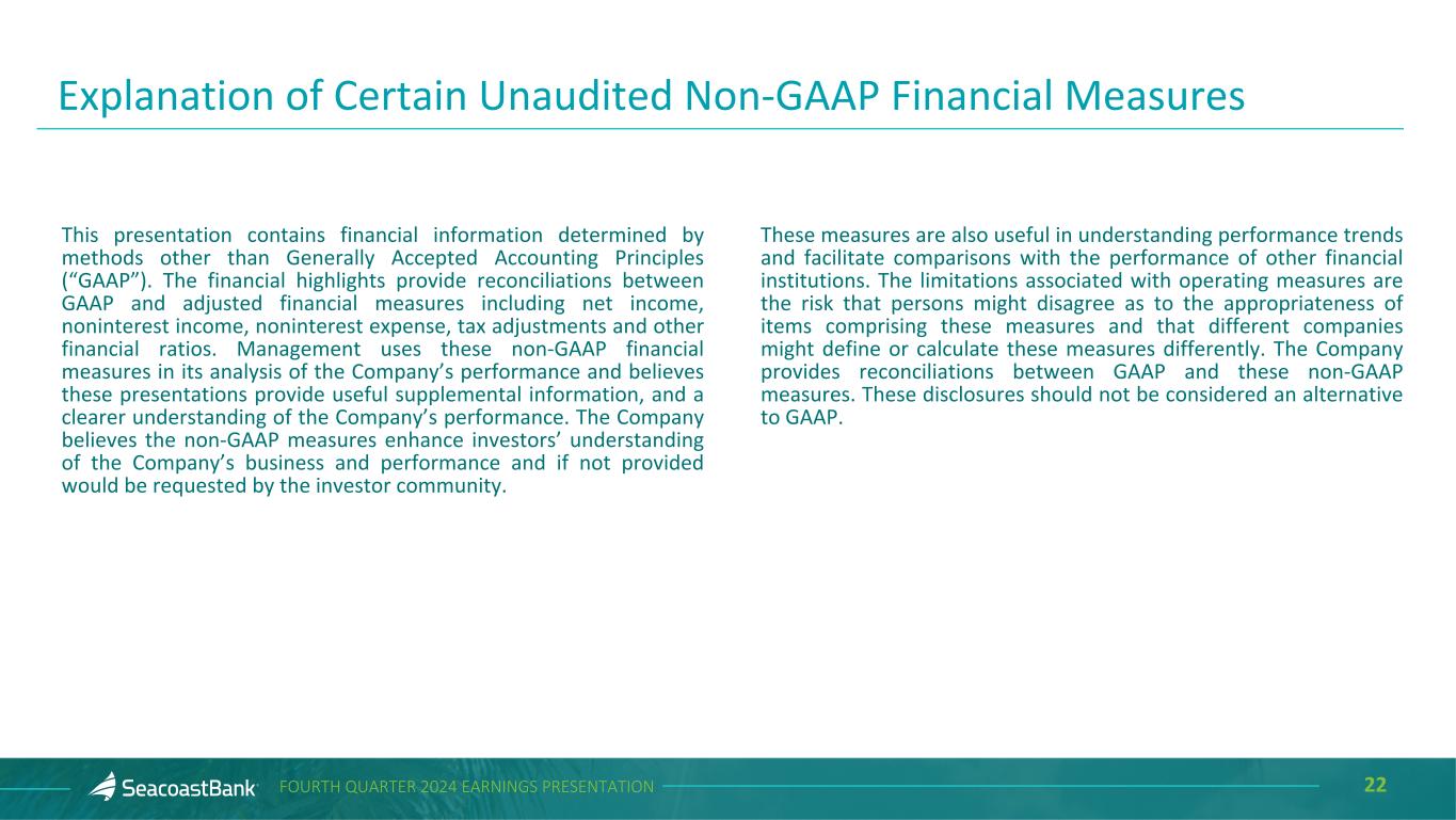 22FOURTH QUARTER 2024 EARNINGS PRESENTATION This presentation contains financial information determined by methods other than Generally Accepted Accounting Principles (“GAAP”). The financial highlights provide reconciliations between GAAP and adjusted financial measures including net income, noninterest income, noninterest expense, tax adjustments and other financial ratios. Management uses these non-GAAP financial measures in its analysis of the Company’s performance and believes these presentations provide useful supplemental information, and a clearer understanding of the Company’s performance. The Company believes the non-GAAP measures enhance investors’ understanding of the Company’s business and performance and if not provided would be requested by the investor community. These measures are also useful in understanding performance trends and facilitate comparisons with the performance of other financial institutions. The limitations associated with operating measures are the risk that persons might disagree as to the appropriateness of items comprising these measures and that different companies might define or calculate these measures differently. The Company provides reconciliations between GAAP and these non-GAAP measures. These disclosures should not be considered an alternative to GAAP. Explanation of Certain Unaudited Non-GAAP Financial Measures