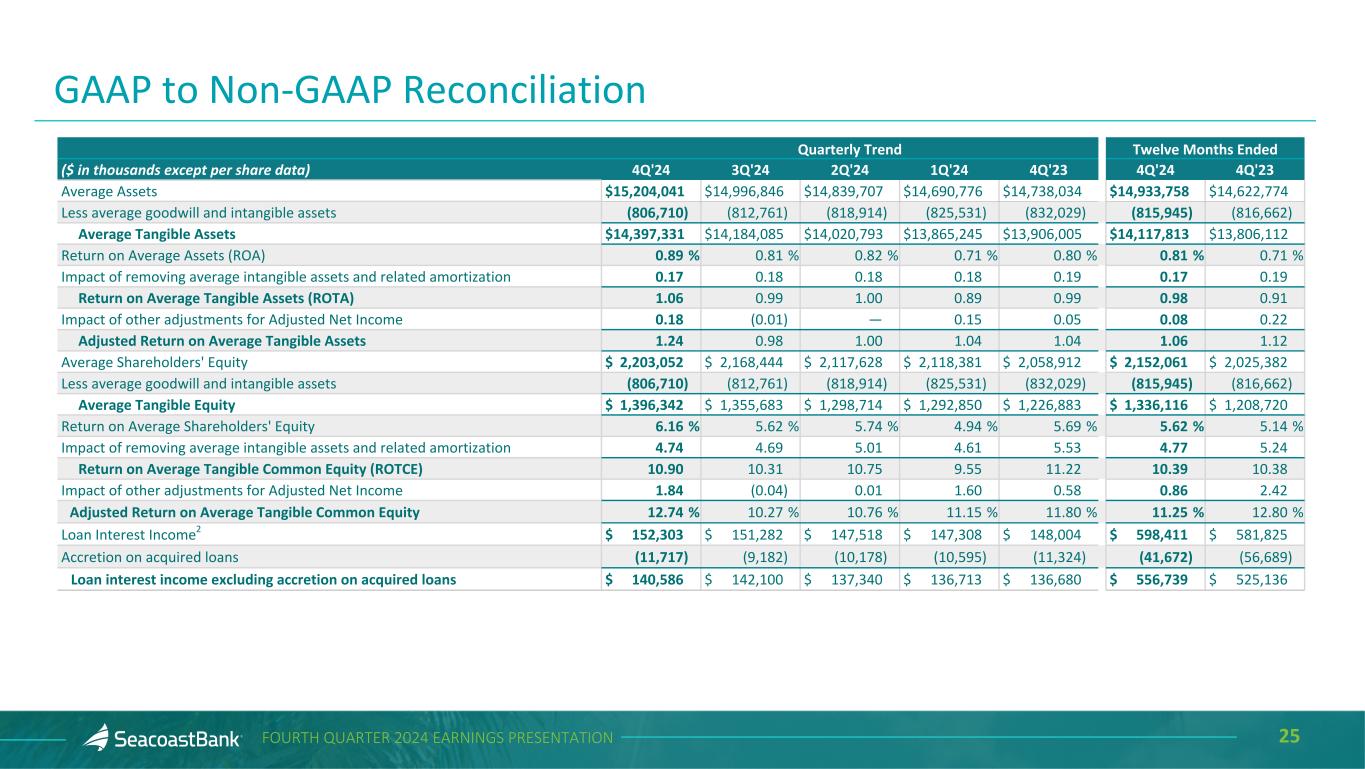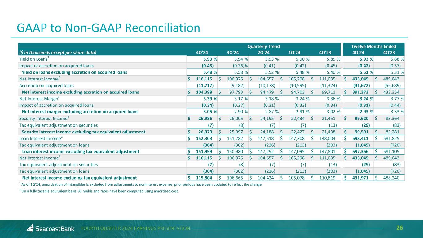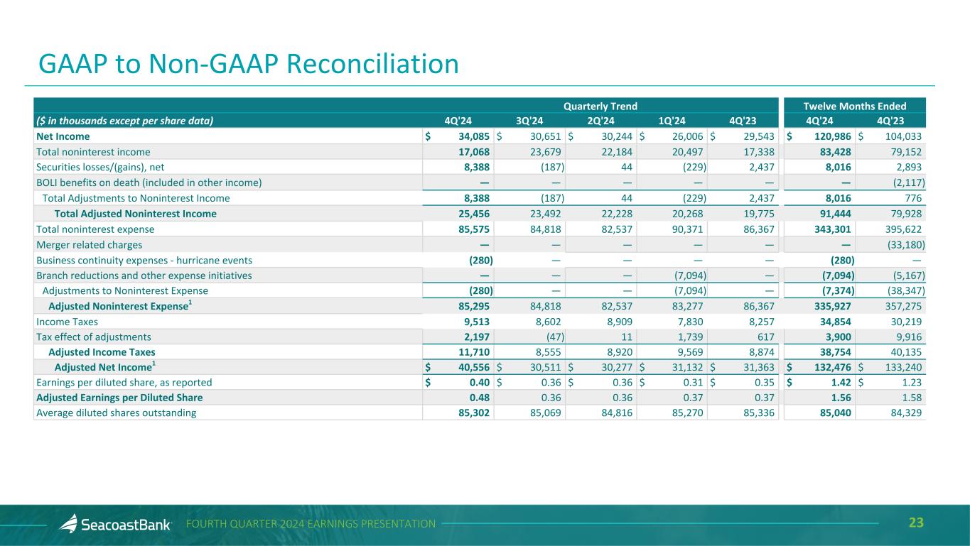 23FOURTH QUARTER 2024 EARNINGS PRESENTATION Quarterly Trend Twelve Months Ended ($ in thousands except per share data) 4Q'24 3Q'24 2Q'24 1Q'24 4Q'23 4Q'24 4Q'23 Net Income $ 34,085 $ 30,651 $ 30,244 $ 26,006 $ 29,543 $ 120,986 $ 104,033 Total noninterest income 17,068 23,679 22,184 20,497 17,338 83,428 79,152 Securities losses/(gains), net 8,388 (187) 44 (229) 2,437 8,016 2,893 BOLI benefits on death (included in other income) — — — — — — (2,117) Total Adjustments to Noninterest Income 8,388 (187) 44 (229) 2,437 8,016 776 Total Adjusted Noninterest Income 25,456 23,492 22,228 20,268 19,775 91,444 79,928 Total noninterest expense 85,575 84,818 82,537 90,371 86,367 343,301 395,622 Merger related charges — — — — — — (33,180) Business continuity expenses - hurricane events (280) — — — — (280) — Branch reductions and other expense initiatives — — — (7,094) — (7,094) (5,167) Adjustments to Noninterest Expense (280) — — (7,094) — (7,374) (38,347) Adjusted Noninterest Expense1 85,295 84,818 82,537 83,277 86,367 335,927 357,275 Income Taxes 9,513 8,602 8,909 7,830 8,257 34,854 30,219 Tax effect of adjustments 2,197 (47) 11 1,739 617 3,900 9,916 Adjusted Income Taxes 11,710 8,555 8,920 9,569 8,874 38,754 40,135 Adjusted Net Income1 $ 40,556 $ 30,511 $ 30,277 $ 31,132 $ 31,363 $ 132,476 $ 133,240 Earnings per diluted share, as reported $ 0.40 $ 0.36 $ 0.36 $ 0.31 $ 0.35 $ 1.42 $ 1.23 Adjusted Earnings per Diluted Share 0.48 0.36 0.36 0.37 0.37 1.56 1.58 Average diluted shares outstanding 85,302 85,069 84,816 85,270 85,336 85,040 84,329 GAAP to Non-GAAP Reconciliation