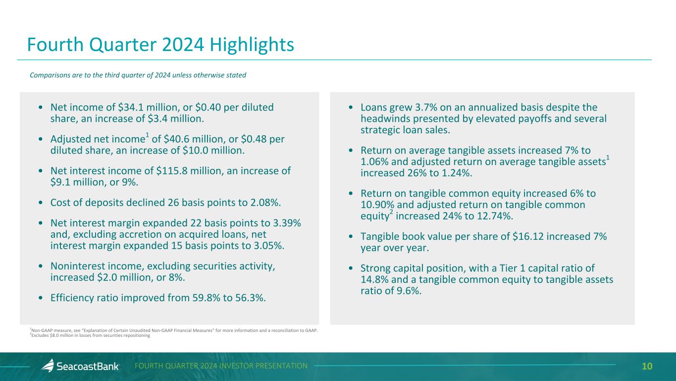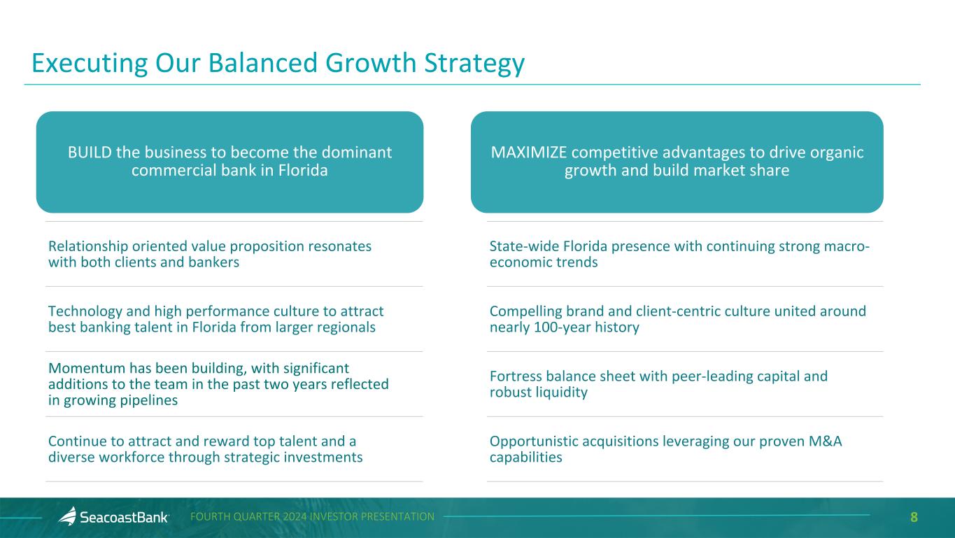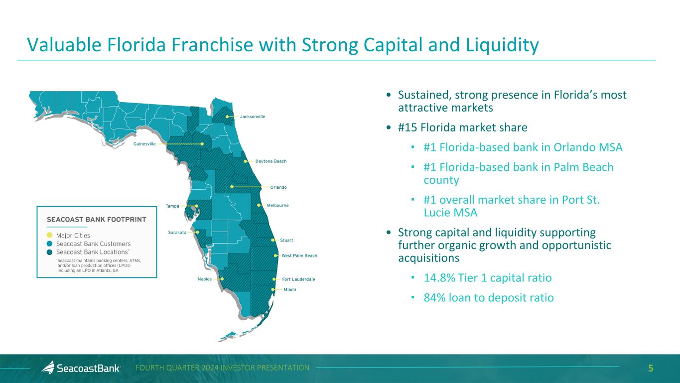 2FOURTH QUARTER 2024 INVESTOR PRESENTATION Cautionary Notice Regarding Forward-Looking Statements This presentation contains “forward-looking statements” within the meaning, and protections, of Section 27A of the Securities Act of 1933, as amended, and Section 21E of the Securities Exchange Act of 1934, as amended, including, without limitation, statements about future financial and operating results, cost savings, enhanced revenues, economic and seasonal conditions in the Company’s markets, and improvements to reported earnings that may be realized from cost controls, tax law changes, new initiatives and for integration of banks that the Company has acquired, or expects to acquire, as well as statements with respect to Seacoast's objectives, strategic plans, expectations and intentions and other statements that are not historical facts. Actual results may differ from those set forth in the forward-looking statements. Forward-looking statements include statements with respect to the Company’s beliefs, plans, objectives, goals, expectations, anticipations, assumptions, estimates and intentions about future performance, and involve known and unknown risks, uncertainties and other factors, which may be beyond the Company’s control, and which may cause the actual results, performance or achievements of Seacoast Banking Corporation of Florida (“Seacoast” or the “Company”) or its wholly-owned banking subsidiary, Seacoast National Bank (“Seacoast Bank”), to be materially different from results, performance or achievements expressed or implied by such forward-looking statements. You should not expect the Company to update any forward-looking statements. All statements other than statements of historical fact could be forward-looking statements. You can identify these forward- looking statements through the use of words such as "may", "will", "anticipate", "assume", "should", "support", "indicate", "would", "believe", "contemplate", "expect", "estimate", "continue", "further", "plan", "point to", "project", "could", "intend", "target" or other similar words and expressions of the future. These forward-looking statements may not be realized due to a variety of factors, including, without limitation: the impact of current and future economic and market conditions generally (including seasonality) and in the financial services industry, nationally and within Seacoast’s primary market areas, including the effects of inflationary pressures, changes in interest rates, slowdowns in economic growth, and the potential for high unemployment rates, as well as the financial stress on borrowers and changes to customer and client behavior and credit risk as a result of the foregoing; potential impacts of adverse developments in the banking industry including those highlighted by high- profile bank failures, and including impacts on customer confidence, deposit outflows, liquidity and the regulatory response thereto (including increases in the cost of our deposit insurance assessments), the Company's ability to effectively manage its liquidity risk and any growth plans, and the availability of capital and funding; governmental monetary and fiscal policies, including interest rate policies of the Board of Governors of the Federal Reserve, as well as legislative, tax and regulatory changes including overdraft and late fee caps (if implemented), including those that impact the money supply and inflation; the risks of changes in interest rates on the level and composition of deposits (as well as the cost of, and competition for, deposits), loan demand, liquidity and the values of loan collateral, securities, and interest rate sensitive assets and liabilities; interest rate risks (including the impacts of interest rates on macroeconomic conditions, customer and client behavior, and on our net interest income), as well as the impact of prolonged elevated interest rates on our financial projections and models, sensitivities and the shape of the yield curve; changes in accounting policies, rules and practices; changes in retail distribution strategies, customer preferences and behavior generally and as a result of economic factors, including heightened or persistent inflation; changes in the availability and cost of credit and capital in the financial markets; changes in the prices, values and sales volumes of residential and commercial real estate, especially as they relate to the value of collateral supporting the Company’s loans; the Company’s concentration in commercial real estate loans and in real estate collateral in Florida; Seacoast’s ability to comply with any regulatory requirements; the risk that the regulatory environment may not be conducive to or may prohibit or delay the consummation of future mergers and/or business combinations, may increase the length of time and amount of resources required to consummate such transactions, and may reduce the anticipated benefit; inaccuracies or other failures from the use of models, including the failure of assumptions and estimates, as well as differences in, and changes to, economic, market and credit conditions; the impact on the valuation of Seacoast’s investments due to market volatility or counterparty payment risk, as well as the effect of a decline in stock market prices on our fee income from our wealth management business; statutory and regulatory dividend restrictions; increases in regulatory capital requirements for banking organizations generally; the risks of mergers, acquisitions and divestitures, including Seacoast’s ability to continue to identify acquisition targets, successfully acquire and integrate desirable financial institutions and realize expected revenues and revenue synergies; changes in technology or products that may be more difficult, costly, or less effective than anticipated; the Company’s ability to identify and address increased cybersecurity risks, including those impacting vendors and other thir