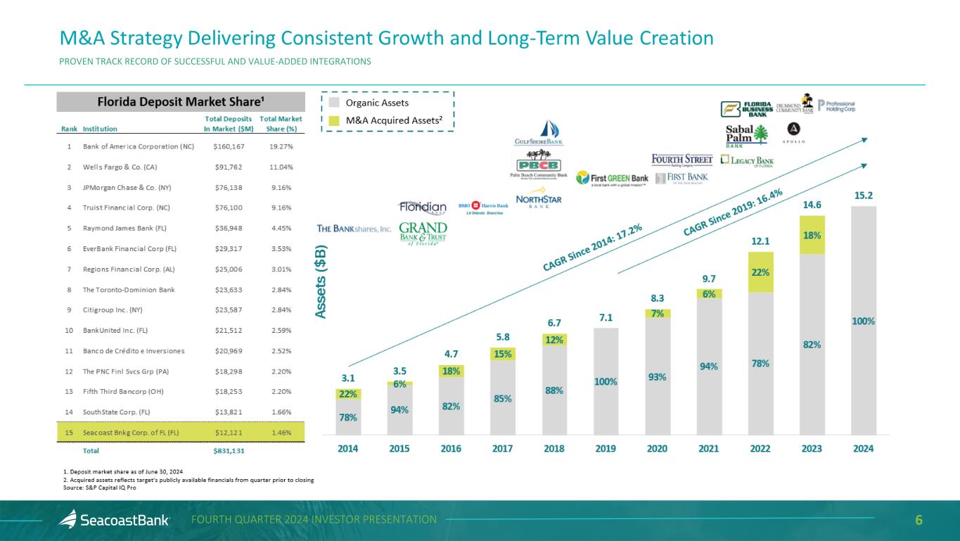 5FOURTH QUARTER 2024 INVESTOR PRESENTATION • Sustained, strong presence in Florida’s most attractive markets • #15 Florida market share ▪ #1 Florida-based bank in Orlando MSA ▪ #1 Florida-based bank in Palm Beach county ▪ #1 overall market share in Port St. Lucie MSA • Strong capital and liquidity supporting further organic growth and opportunistic acquisitions ▪ 14.8% Tier 1 capital ratio ▪ 84% loan to deposit ratio Valuable Florida Franchise with Strong Capital and Liquidity