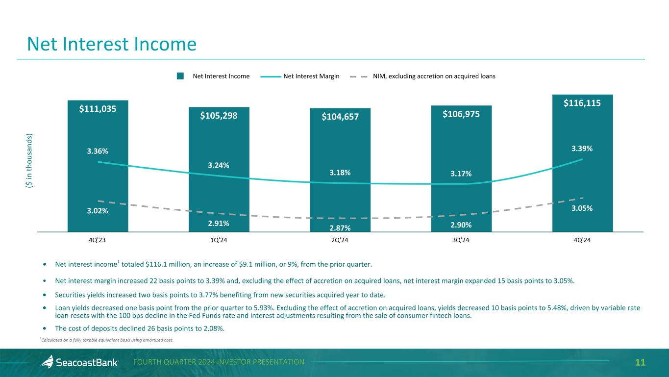10FOURTH QUARTER 2024 INVESTOR PRESENTATION • Net income of $34.1 million, or $0.40 per diluted share, an increase of $3.4 million. • Adjusted net income1 of $40.6 million, or $0.48 per diluted share, an increase of $10.0 million. • Net interest income of $115.8 million, an increase of $9.1 million, or 9%. • Cost of deposits declined 26 basis points to 2.08%. • Net interest margin expanded 22 basis points to 3.39% and, excluding accretion on acquired loans, net interest margin expanded 15 basis points to 3.05%. • Noninterest income, excluding securities activity, increased $2.0 million, or 8%. • Efficiency ratio improved from 59.8% to 56.3%. Fourth Quarter 2024 Highlights Comparisons are to the third quarter of 2024 unless otherwise stated • Loans grew 3.7% on an annualized basis despite the headwinds presented by elevated payoffs and several strategic loan sales. • Return on average tangible assets increased 7% to 1.06% and adjusted return on average tangible assets1 increased 26% to 1.24%. • Return on tangible common equity increased 6% to 10.90% and adjusted return on tangible common equity2 increased 24% to 12.74%. • Tangible book value per share of $16.12 increased 7% year over year. • Strong capital position, with a Tier 1 capital ratio of 14.8% and a tangible common equity to tangible assets ratio of 9.6%. 1Non-GAAP measure, see “Explanation of Certain Unaudited Non-GAAP Financial Measures" for more information and a reconciliation to GAAP. 2Excludes $8.0 million in losses from securities repositioning
