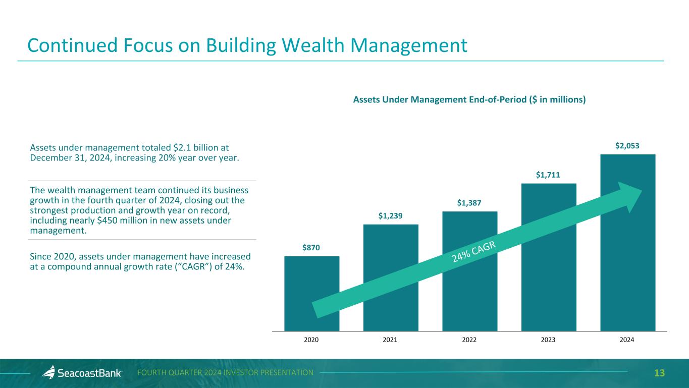 12FOURTH QUARTER 2024 INVESTOR PRESENTATION Noninterest income decreased $6.6 million from the prior quarter to $17.1 million, and adjusted noninterest income1 increased $2.0 million to $25.5 million. Changes from the prior quarter include: Service charges on deposits totaled $5.1 million, a decrease of $0.3 million, or 5%. The fourth quarter of 2024 was modestly impacted by hurricane-related fee waivers, while our investments in talent and significant market expansion across the state have resulted in continued growth in treasury management services to commercial customers. Wealth management income totaled $4.0 million, an increase of $0.2 million, or 5%. During 2024, assets under management increased $341.7 million, or 20%, reaching $2.1 billion at December 31, 2024. Insurance agency income totaled $1.2 million, a decrease of 18%, reflecting typical fourth quarter seasonality. Other income totaled $10.3 million, an increase of $2.5 million, or 31%. Fourth quarter results include gains on SBIC investments and gains on the sale of two nonperforming commercial real estate loans. Recognized $8.0 million in pre-tax losses on the sale of securities with an average book yield of 2.8%. The proceeds of $113 million were reinvested in agency mortgage-backed securities with an average book yield of 5.4% for an estimated earnback of less than three years. 1Non-GAAP measure, see “Explanation of Certain Unaudited Non-GAAP Financial Measures" for more information and a reconciliation to GAAP. Noninterest Income $19,775 $20,268 $22,228 $23,492 $25,456 Adjusted noninterest income Securities (losses) gains 4Q'23 1Q'24 2Q'24 3Q'24 4Q'24 ($ in thousands) $229 $(44)$(2,437) Noninterest income decreased 2% and adjusted noninterest income1, which excludes securities activity, increased 29% year over year. 1 $187 $(8,388)
