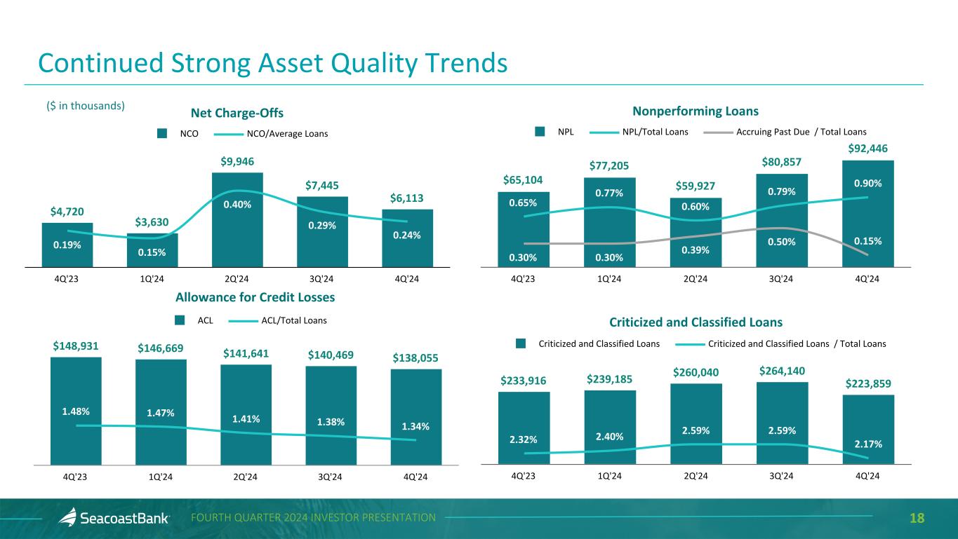 17FOURTH QUARTER 2024 INVESTOR PRESENTATION Allowance for Credit Losses and Purchase Discount ($ in thousands) Loans Outstanding Allowance for Credit Losses % of Loans Outstanding Purchase Discount % of Loans Outstanding Construction and Land Development $ 648,054 $ 7,252 1.12 % $ 2,556 0.39 % Owner Occupied Commercial Real Estate 1,686,629 11,825 0.70 18,959 1.12 Commercial Real Estate 3,503,807 43,866 1.25 58,431 1.67 Residential Real Estate 2,616,784 39,168 1.50 33,322 1.27 Commercial & Financial 1,651,355 27,533 1.67 13,981 0.85 Consumer 193,321 8,411 4.35 803 0.42 Total $ 10,299,950 $ 138,055 1.34 % $ 128,052 1.24 % The total allowance for credit losses of $138.1 million as of December 31, 2024 represents management’s estimate of lifetime expected credit losses. The $128.1 million remaining unrecognized discount on acquired loans represents 1.24% of total loans. Additionally, a reserve for potential credit losses on lending-related commitments of $5.7 million is reflected within Other Liabilities.