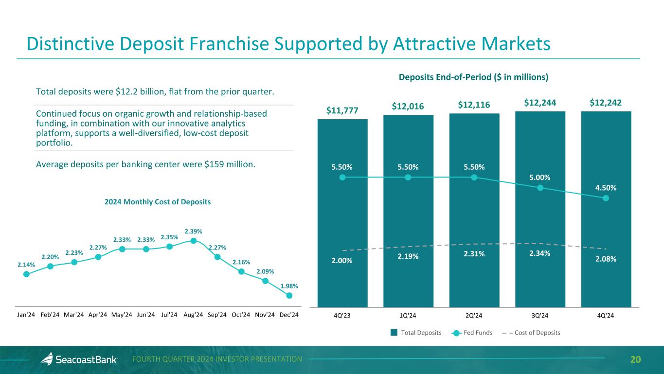 19FOURTH QUARTER 2024 INVESTOR PRESENTATION Investment Securities Performance and Composition Portfolio yield increased two basis points to 3.77% from 3.75% in the prior quarter primarily due to new purchases. Net unrealized losses in the AFS portfolio increased during the fourth quarter by $42.7 million, driven by rising longer term interest rates, which contributed $0.38 to the decrease in tangible book value per share. High quality AFS portfolio consisting of 86% agency backed securities, with the remainder comprised primarily of highly-rated investment grade bonds. CLO portfolio is entirely AA/AAA rated. Recognized pre-tax losses of approximately $8.0 million on sales of AFS securities. Transaction benefits: • Sold securities with an average book yield of 2.8%, resulting in proceeds of $113 million, which were reinvested in agency mortgage-backed securities with an average book yield of 5.4%. • Expected earnback of less than three years, with the benefit of higher yields extending beyond the earnback period. Net Unrealized Loss in Securities ($ in thousands) 12/31/2024 9/30/2024 △ from 3Q'24 Total Available-for-Sale $ (207,846) $ (165,144) $ (42,702) Total Held-to-Maturity (127,592) (107,565) (20,027) Total Securities $ (335,438) $ (272,709) $ (62,729) ($ in m ill io ns ) $680 $670 $658 $646 $635 $1,836 $1,949 $1,967 $2,160 $2,227 3.42% 3.47% 3.69% 3.75% 3.77% HTM Securities AFS Securities Yield 4Q'23 1Q'24 2Q'24 3Q'24 4Q'24