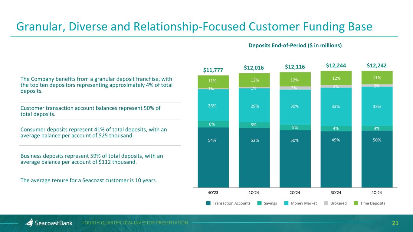 20FOURTH QUARTER 2024 INVESTOR PRESENTATION Deposits End-of-Period ($ in millions) $11,777 $12,016 $12,116 $12,244 $12,242 5.50% 5.50% 5.50% 5.00% 4.50% 2.00% 2.19% 2.31% 2.34% 2.08% Total Deposits Fed Funds Cost of Deposits 4Q'23 1Q'24 2Q'24 3Q'24 4Q'24 Distinctive Deposit Franchise Supported by Attractive Markets Total deposits were $12.2 billion, flat from the prior quarter. Continued focus on organic growth and relationship-based funding, in combination with our innovative analytics platform, supports a well-diversified, low-cost deposit portfolio. Average deposits per banking center were $159 million. 2024 Monthly Cost of Deposits 2.14% 2.20% 2.23% 2.27% 2.33% 2.33% 2.35% 2.39% 2.27% 2.16% 2.09% 1.98% Jan'24 Feb'24 Mar'24 Apr'24 May'24 Jun'24 Jul'24 Aug'24 Sep'24 Oct'24 Nov'24 Dec'24