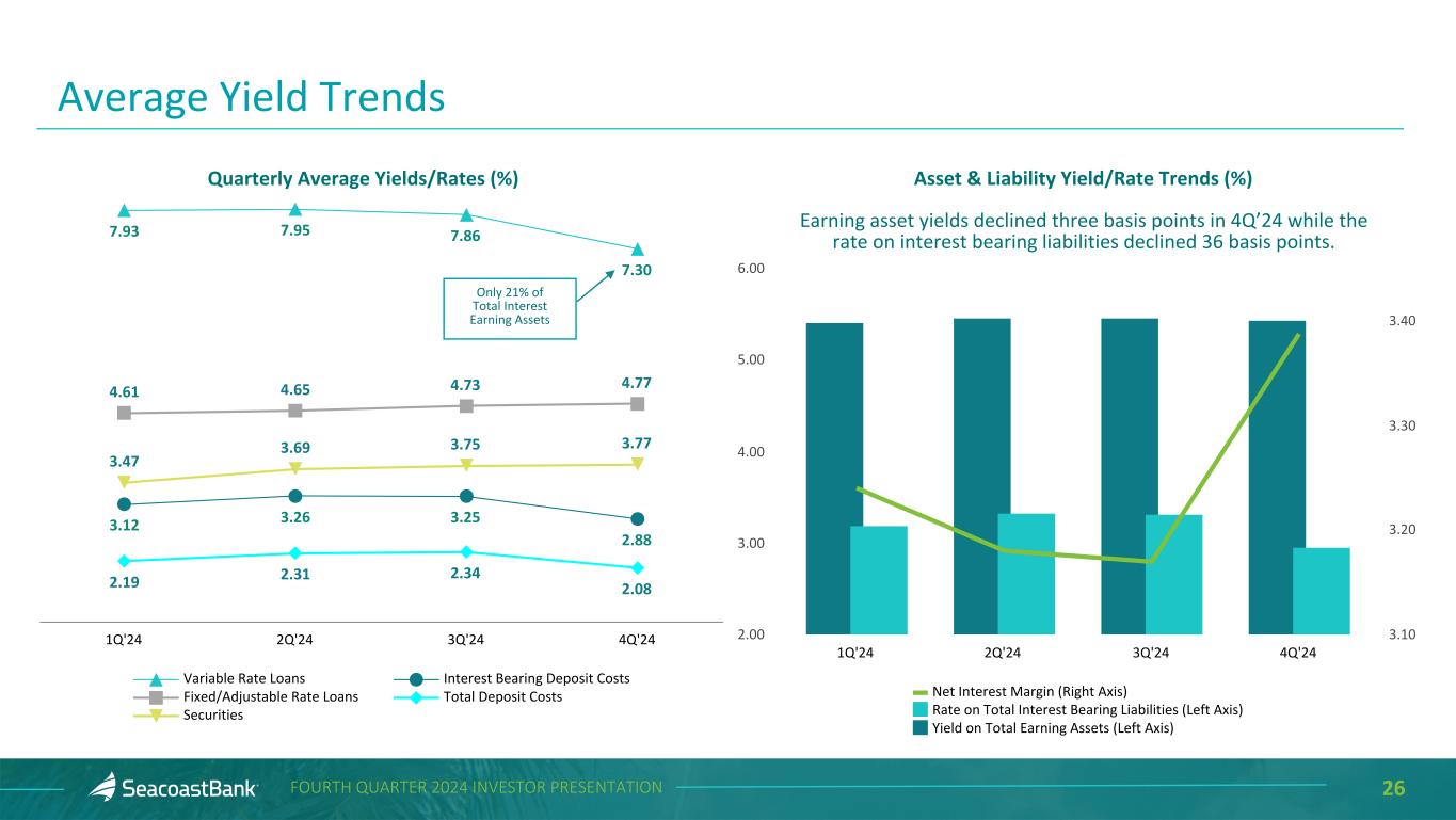25FOURTH QUARTER 2024 INVESTOR PRESENTATION Quarterly Trend Twelve Months Ended ($ in thousands) 4Q'24 3Q'24 2Q'24 1Q'24 4Q'23 4Q'24 4Q'23 Commercial pipeline at period end $ 605,357 $ 744,548 $ 743,789 $ 498,617 $ 306,531 $ 605,357 $ 306,531 Commercial loan originations 711,506 499,655 405,957 260,032 334,229 1,877,150 1,055,889 SBA pipeline at period end 28,793 28,944 29,296 15,630 20,600 28,793 20,600 SBA originations 36,836 18,386 8,226 18,944 25,034 82,392 48,914 Residential pipeline-saleable at period end 6,727 11,222 12,095 9,279 2,657 6,727 2,657 Residential loans-sold 11,764 23,200 21,417 15,305 15,614 71,686 66,252 Residential pipeline-portfolio at period end 35,068 21,920 24,721 24,364 44,422 35,068 44,422 Residential loans-retained1 99,916 51,507 42,431 51,435 41,186 245,289 260,500 Consumer pipeline at period end 17,384 24,447 24,532 25,057 18,745 17,384 18,745 Consumer originations 42,607 65,140 59,973 48,244 61,847 215,964 346,164 Total Pipelines at Period End $ 693,329 $ 831,081 $ 834,433 $ 572,947 $ 392,955 $ 693,329 $ 392,955 Total Originations $ 902,629 $ 657,888 $ 538,004 $ 393,960 $ 477,910 $ 2,492,481 $ 1,777,719 Loan Production and Pipeline Trend 1Includes purchases of $44.6 million in 4Q'24.