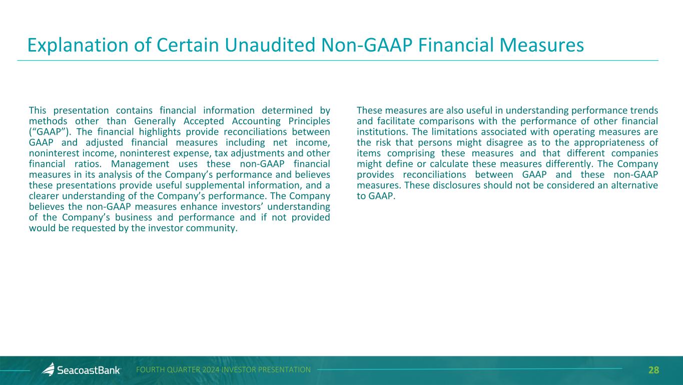28FOURTH QUARTER 2024 INVESTOR PRESENTATION This presentation contains financial information determined by methods other than Generally Accepted Accounting Principles (“GAAP”). The financial highlights provide reconciliations between GAAP and adjusted financial measures including net income, noninterest income, noninterest expense, tax adjustments and other financial ratios. Management uses these non-GAAP financial measures in its analysis of the Company’s performance and believes these presentations provide useful supplemental information, and a clearer understanding of the Company’s performance. The Company believes the non-GAAP measures enhance investors’ understanding of the Company’s business and performance and if not provided would be requested by the investor community. These measures are also useful in understanding performance trends and facilitate comparisons with the performance of other financial institutions. The limitations associated with operating measures are the risk that persons might disagree as to the appropriateness of items comprising these measures and that different companies might define or calculate these measures differently. The Company provides reconciliations between GAAP and these non-GAAP measures. These disclosures should not be considered an alternative to GAAP. Explanation of Certain Unaudited Non-GAAP Financial Measures