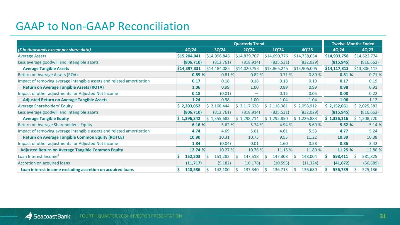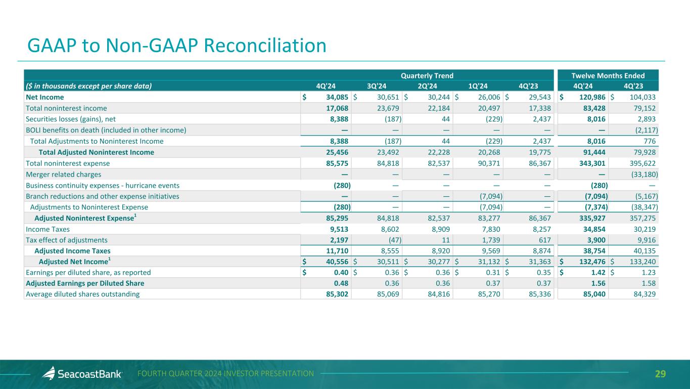29FOURTH QUARTER 2024 INVESTOR PRESENTATION Quarterly Trend Twelve Months Ended ($ in thousands except per share data) 4Q'24 3Q'24 2Q'24 1Q'24 4Q'23 4Q'24 4Q'23 Net Income $ 34,085 $ 30,651 $ 30,244 $ 26,006 $ 29,543 $ 120,986 $ 104,033 Total noninterest income 17,068 23,679 22,184 20,497 17,338 83,428 79,152 Securities losses (gains), net 8,388 (187) 44 (229) 2,437 8,016 2,893 BOLI benefits on death (included in other income) — — — — — — (2,117) Total Adjustments to Noninterest Income 8,388 (187) 44 (229) 2,437 8,016 776 Total Adjusted Noninterest Income 25,456 23,492 22,228 20,268 19,775 91,444 79,928 Total noninterest expense 85,575 84,818 82,537 90,371 86,367 343,301 395,622 Merger related charges — — — — — — (33,180) Business continuity expenses - hurricane events (280) — — — — (280) — Branch reductions and other expense initiatives — — — (7,094) — (7,094) (5,167) Adjustments to Noninterest Expense (280) — — (7,094) — (7,374) (38,347) Adjusted Noninterest Expense1 85,295 84,818 82,537 83,277 86,367 335,927 357,275 Income Taxes 9,513 8,602 8,909 7,830 8,257 34,854 30,219 Tax effect of adjustments 2,197 (47) 11 1,739 617 3,900 9,916 Adjusted Income Taxes 11,710 8,555 8,920 9,569 8,874 38,754 40,135 Adjusted Net Income1 $ 40,556 $ 30,511 $ 30,277 $ 31,132 $ 31,363 $ 132,476 $ 133,240 Earnings per diluted share, as reported $ 0.40 $ 0.36 $ 0.36 $ 0.31 $ 0.35 $ 1.42 $ 1.23 Adjusted Earnings per Diluted Share 0.48 0.36 0.36 0.37 0.37 1.56 1.58 Average diluted shares outstanding 85,302 85,069 84,816 85,270 85,336 85,040 84,329 GAAP to Non-GAAP Reconciliation