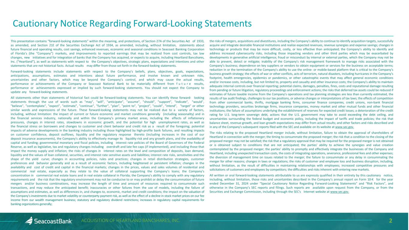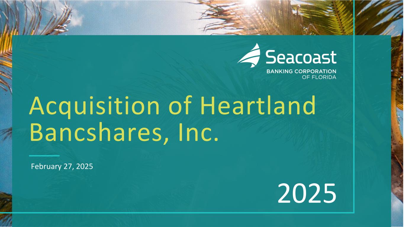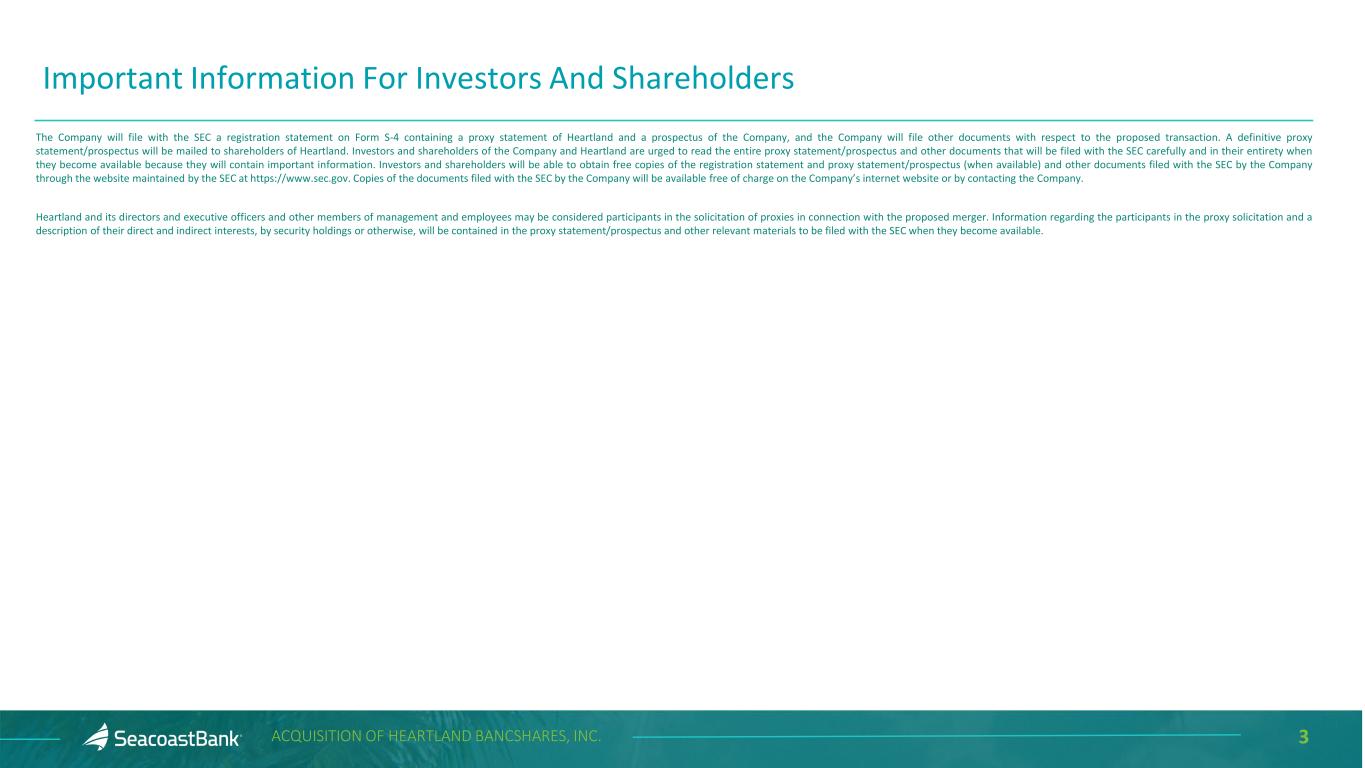 2ACQUISITION OF HEARTLAND BANCSHARES, INC. Cautionary Notice Regarding Forward-Looking Statements This presentation contains “forward-looking statements” within the meaning, and protections, of Section 27A of the Securities Act of 1933, as amended, and Section 21E of the Securities Exchange Act of 1934, as amended, including, without limitation, statements about future financial and operating results, cost savings, enhanced revenues, economic and seasonal conditions in Seacoast Banking Corporation of Florida’s (the “Company”) markets, and improvements to reported earnings that may be realized from cost controls, tax law changes, new initiatives and for integration of banks that the Company has acquired, or expects to acquire, including Heartland Bancshares, Inc. (“Heartland”), as well as statements with respect to the Company's objectives, strategic plans, expectations and intentions and other statements that are not historical facts. Actual results may differ from those set forth in the forward-looking statements. Forward-looking statements include statements with respect to the Company’s beliefs, plans, objectives, goals, expectations, anticipations, assumptions, estimates and intentions about future performance, and involve known and unknown risks, uncertainties and other factors, which may be beyond the Company’s control, and which may cause the actual results, performance or achievements of the Company or Seacoast National Bank to be materially different from f u t u r e results, performance or achievements expressed or implied by such forward-looking statements. You should not expect the Company to update any forward-looking statements. All statements other than statements of historical fact could be forward-looking statements. You can identify these forward- looking statements through the use of words such as "may", "will", "anticipate", "assume", "should", "support", "indicate", "would", "believe", "contemplate", "expect", "estimate", "continue", "further", "plan", "point to", "project", "could", "intend", "target" or other similar words and expressions of the future. These forward-looking statements may not be realized due to a variety of factors, including, without limitation: the impact of current or future economic and market conditions generally (including seasonality) and in the financial services industry, nationally and within the Company’s primary market areas, including the effects of inflationary pressures, changes in interest rates, slowdowns in economic growth, and the potential for high unemployment rates, as well as the financial stress on borrowers and changes to customer and client behavior and credit risk as a result of the foregoing; potential impacts of adverse developments in the banking industry including those highlighted by high-profile bank failures, and resulting impacts on customer confidence, deposit outflows, liquidity and the regulatory response thereto (including increases in the cost of our deposit insurance assessments), the Company's ability to effectively manage its liquidity risk and any growth plans, and the availability of capital and funding; governmental monetary and fiscal policies, including interest rate policies of the Board of Governors of the Federal Reserve, as well as legislative, tax and regulatory changes including overdraft and late fee caps (if implemented), and including those that impact the money supply and inflation; the risks of changes in interest rates on the level and composition of deposits, loan demand, liquidity and the values of loan collateral, securities, and interest rate sensitive assets and liabilities; interest rate risks, sensitivities and the shape of the yield curve; changes in accounting policies, rules and practices; changes in retail distribution strategies, customer preferences and behavior generally and as a result of economic factors, including heightened or persistent inflation; changes in the availability and cost of credit and capital in the financial markets; changes in the prices, values and sales volumes of residential and commercial real estate, especially as they relate to the value of collateral supporting the Company’s loans; the Company’s concentration in commercial real estate loans and in real estate collateral in Florida; the Company’s ability to comply with any regulatory requirements and the risk that the regulatory environment may not be conducive to or may prohibit or delay the consummation of future mergers and/or business combinations, may increase the length of time and amount of resources required to consummate such transactions, and may reduce the anticipated benefit; inaccuracies or other failures from the use of models, including the failure of assumptions and estimates, as well as differences in, and changes to, economic, market and credit conditions; the impact on the valuation of the Company’s investments due to market volatility or counterparty payment risk, as well as the effect of a decline in stock market prices on our fee income from our wealth management business; statutory and regulatory dividend restrictions; increases in regulatory capital requirements for banking organizations generally; the risks of mergers, acquisitions and divestitures, including the Company’s ability to continue to identify acquisition targets, successfully acquire and integrate desirable financial institutions and realize expected revenues, revenue synergies and expense savings; changes in technology or products that may be more difficult, costly, or less effective than anticipated; the Company’s ability to identify and address increased cybersecurity risks, including those impacting vendors and other third parties which may be exacerbated by developments in generative artificial intelligence; fraud or misconduct by internal or external parties, which the Company may not be able to prevent, detect or mitigate; inability of the Company’s risk management framewo