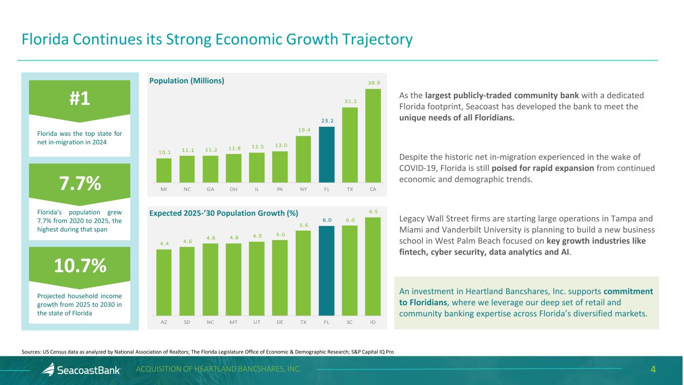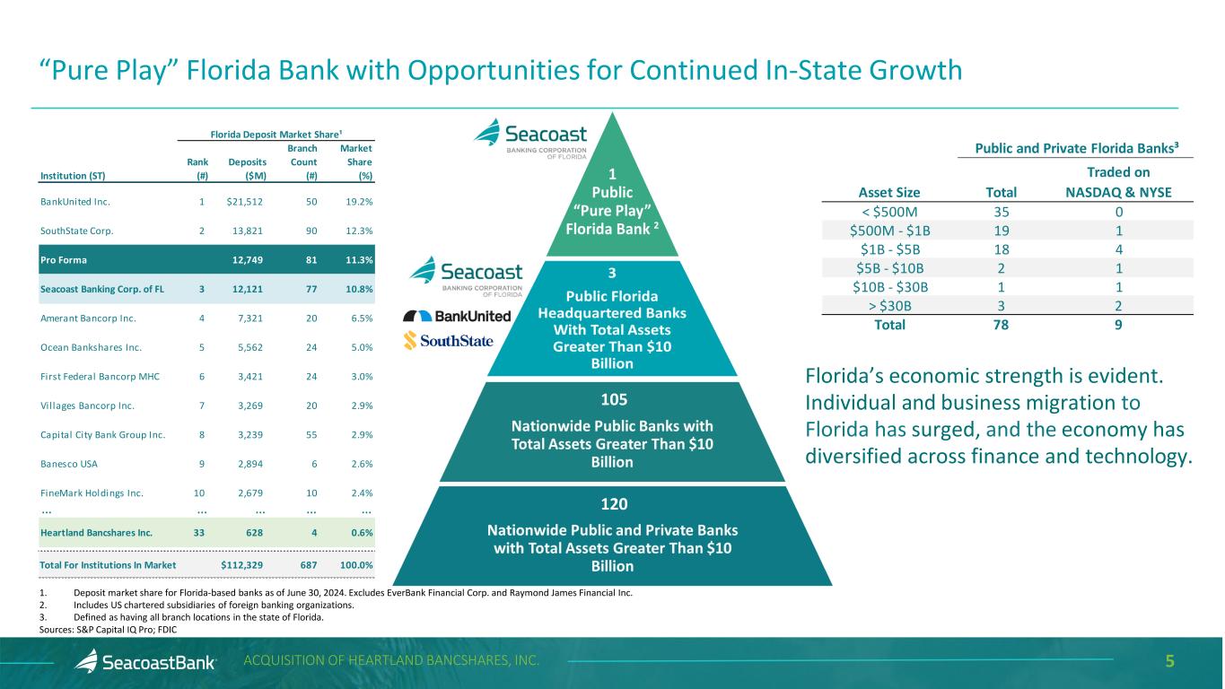 4ACQUISITION OF HEARTLAND BANCSHARES, INC. Florida Continues its Strong Economic Growth Trajectory Florida was the top state for net in-migration in 2024 #1 Florida’s population grew 7.7% from 2020 to 2025, the highest during that span 7.7% Projected household income growth from 2025 to 2030 in the state of Florida 10.7% Sources: US Census data as analyzed by National Association of Realtors; The Florida Legislature Office of Economic & Demographic Research; S&P Capital IQ Pro 38.9 31.2 23.2 19.4 13.012.511.811.211.110.1 CATXFLNYPAILOHGANCMI 6.5 6.06.0 5.6 5.04.94.84.8 4.64.4 IDSCFLTXDEUTMTNCSDAZ Population (Millions) Expected 2025-’30 Population Growth (%) As the largest publicly-traded community bank with a dedicated Florida footprint, Seacoast has developed the bank to meet the unique needs of all Floridians. Despite the historic net in-migration experienced in the wake of COVID-19, Florida is still poised for rapid expansion from continued economic and demographic trends. Legacy Wall Street firms are starting large operations in Tampa and Miami and Vanderbilt University is planning to build a new business school in West Palm Beach focused on key growth industries like fintech, cyber security, data analytics and AI. An investment in Heartland Bancshares, Inc. supports commitment to Floridians, where we leverage our deep set of retail and community banking expertise across Florida’s diversified markets.