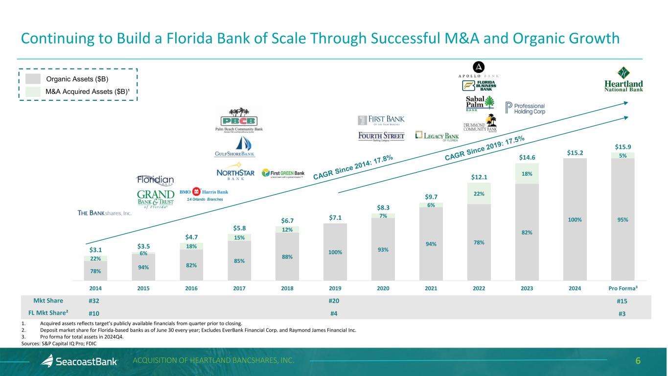 5ACQUISITION OF HEARTLAND BANCSHARES, INC. “Pure Play” Florida Bank with Opportunities for Continued In-State Growth Florida Deposit Market Share¹ Branch Market Rank Deposits Count Share Institution (ST) (#) ($M) (#) (%) BankUnited Inc. 1 $21,512 50 19.2% SouthState Corp. 2 13,821 90 12.3% Pro Forma 12,749 81 11.3% Seacoast Banking Corp. of FL 3 12,121 77 10.8% Amerant Bancorp Inc. 4 7,321 20 6.5% Ocean Bankshares Inc. 5 5,562 24 5.0% First Federal Bancorp MHC 6 3,421 24 3.0% Villages Bancorp Inc. 7 3,269 20 2.9% Capital City Bank Group Inc. 8 3,239 55 2.9% Banesco USA 9 2,894 6 2.6% FineMark Holdings Inc. 10 2,679 10 2.4% … … … … … Heartland Bancshares Inc. 33 628 4 0.6% Total For Institutions In Market $112,329 687 100.0% Public and Private Florida Banks³ Asset Size Total Traded on NASDAQ & NYSE < $500M 35 0 $500M - $1B 19 1 $1B - $5B 18 4 $5B - $10B 2 1 $10B - $30B 1 1 > $30B 3 2 Total 78 9 Florida’s economic strength is evident. Individual and business migration to Florida has surged, and the economy has diversified across finance and technology. 1. Deposit market share for Florida-based banks as of June 30, 2024. Excludes EverBank Financial Corp. and Raymond James Financial Inc. 2. Includes US chartered subsidiaries of foreign banking organizations. 3. Defined as having all branch locations in the state of Florida. Sources: S&P Capital IQ Pro; FDIC 120 105 2