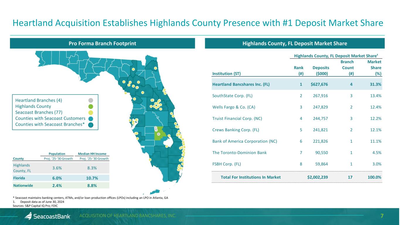 6ACQUISITION OF HEARTLAND BANCSHARES, INC. Continuing to Build a Florida Bank of Scale Through Successful M&A and Organic Growth 78% 94% 82% 85% 88% 100% 93% 94% 78% 82% 100% 95% 22% 6% 18% 15% 12% 7% 6% 22% 18% 5% $3.1 $3.5 $4.7 $5.8 $6.7 $7.1 $8.3 $9.7 $12.1 $14.6 $15.2 $15.9 2014 2015 2016 2017 2018 2019 2020 2021 2022 2023 2024 Pro Forma³ Mkt Share FL Mkt Share² #32 #10 #20 #4 #15 #3 Organic Assets ($B) M&A Acquired Assets ($B)¹ 1. Acquired assets reflects target’s publicly available financials from quarter prior to closing. 2. Deposit market share for Florida-based banks as of June 30 every year; Excludes EverBank Financial Corp. and Raymond James Financial Inc. 3. Pro forma for total assets in 2024Q4. Sources: S&P Capital IQ Pro; FDIC
